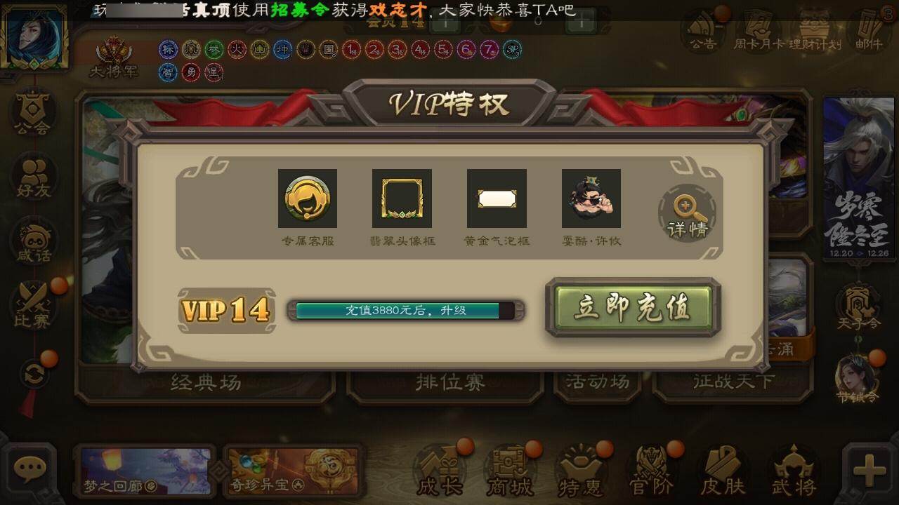 官阶:大将军;VIP等级:VIP14;史诗武将数量:75;动态皮肤数量:53