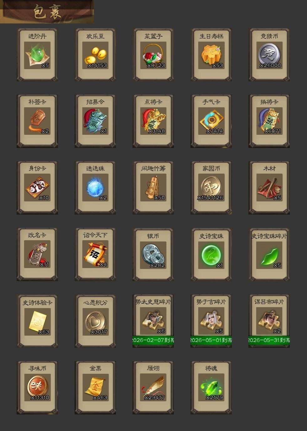 官阶:大将军;VIP等级:VIP9;史诗武将数量:36;动态皮肤数量:36;武将总数:348;史诗宝珠数量:1;将魂数量:2179;神将:7;魏国史诗武将:16;蜀国史诗武将:6;吴国史诗武将:5;群史诗武将:10