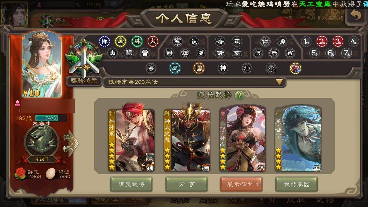 官阶:骠骑将军;VIP等级:VIP10;史诗武将数量:35;动态皮肤数量:2