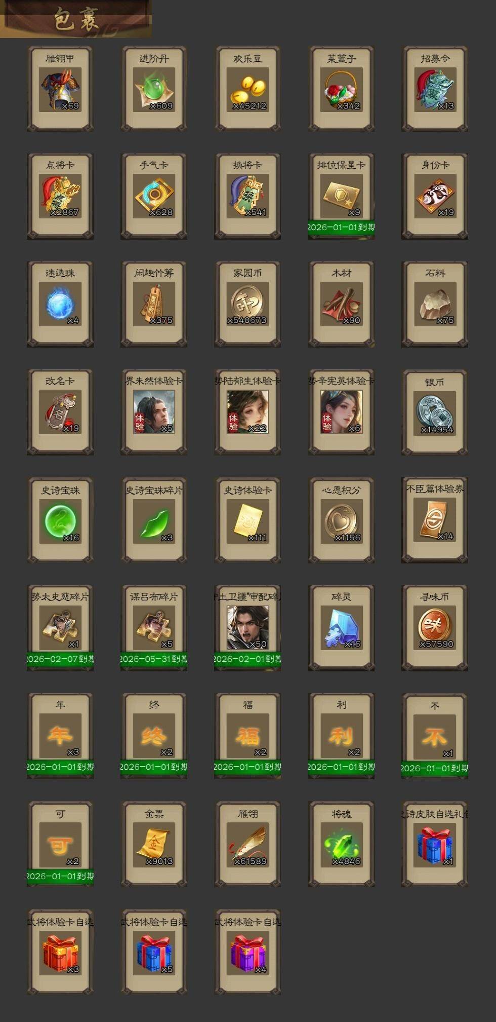官阶:骠骑将军;VIP等级:VIP10;史诗武将数量:35;动态皮肤数量:27;武将总数:322;史诗宝珠数量:16;将魂数量:4846;神将:6;魏国史诗武将:12;蜀国史诗武将:12;吴国史诗武将:3;群史诗武将:10