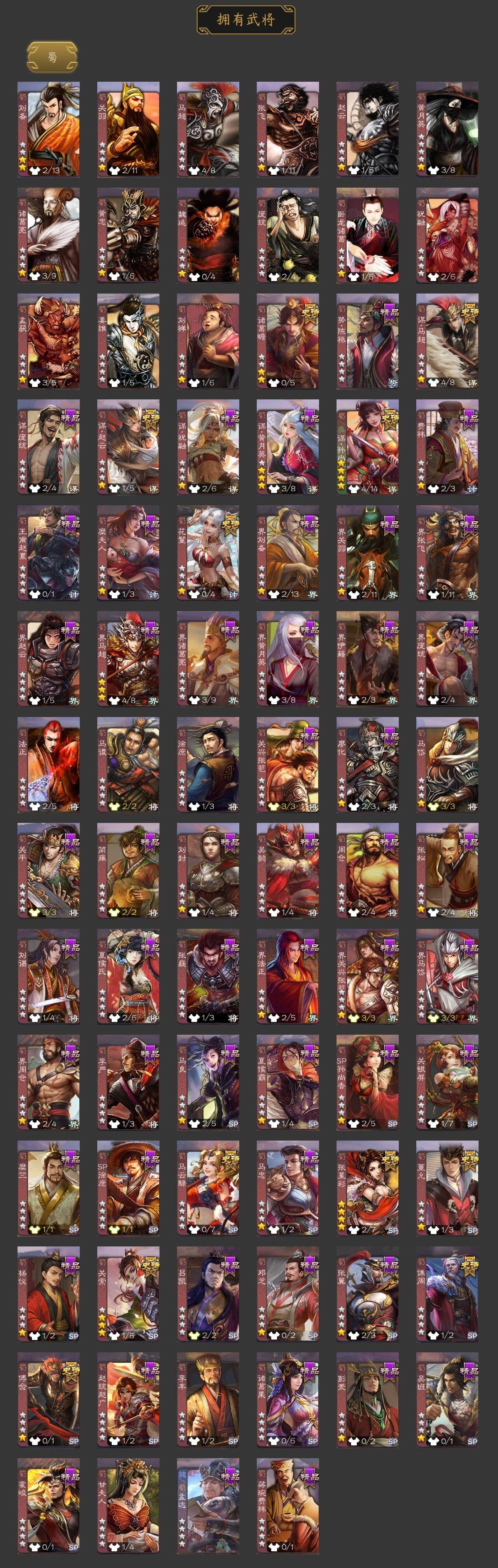神赵云,神张辽,神太史慈,神孙策,神吕蒙,神周瑜,郭女王,王粲,杨修,界钟会,界曹真,嵇康,曹纯,戏志才,关索,马云騄,谋孙尚香,谋赵云,谋马超,诸葛瞻,张星彩,谯周,傅佥,花鬘,董允,吴景,界徐盛,势陆郁生,谋黄月英,裴秀,左慈,张让,星黄忠,星甘宁,南华老仙,阎象,许攸,