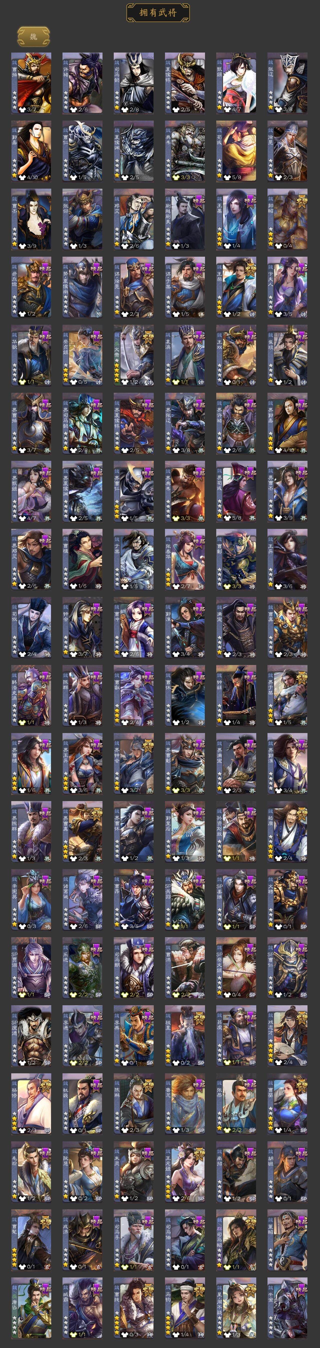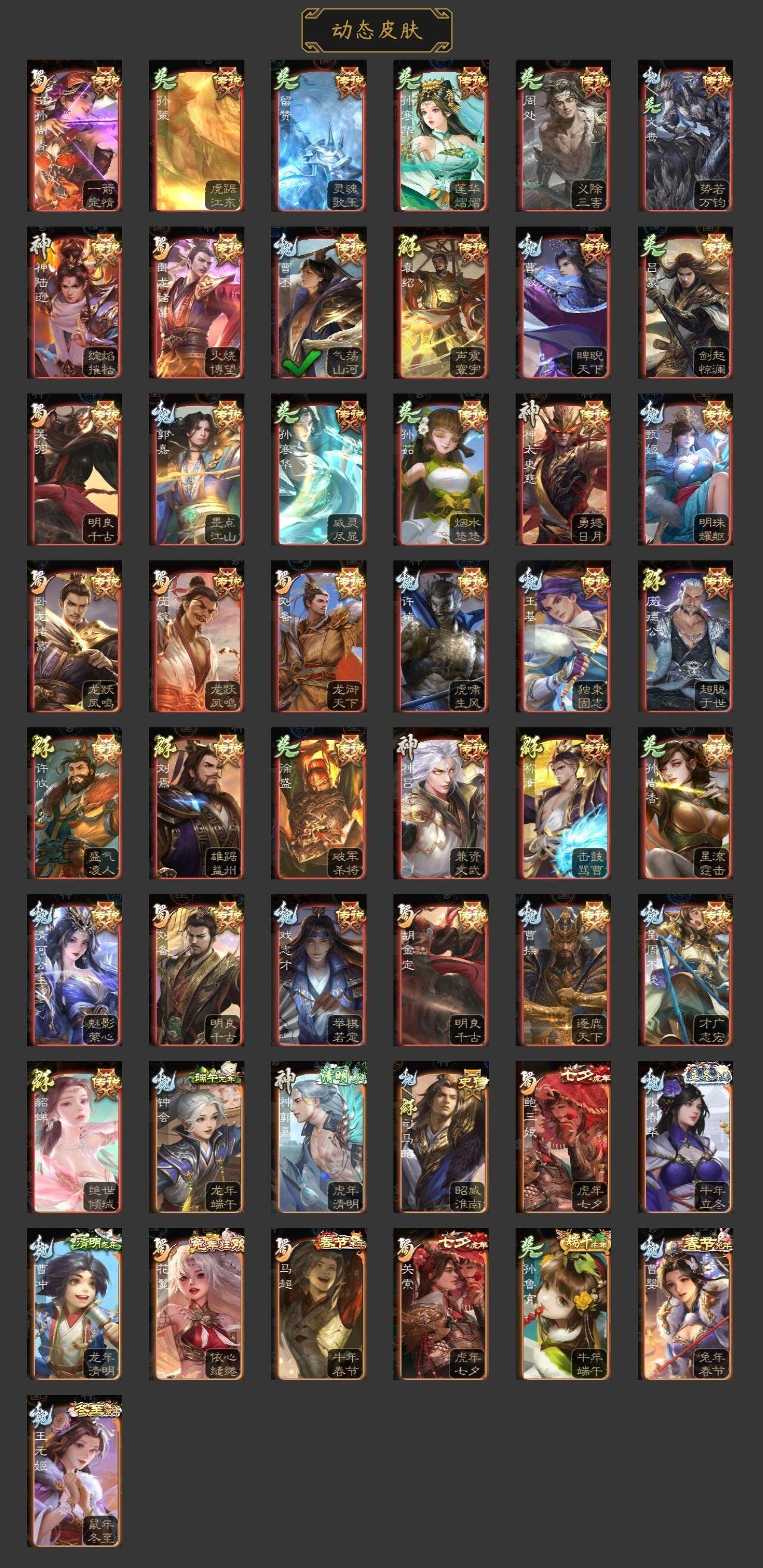 神赵云,神陆逊,神刘备,神张辽,神郭嘉,神太史慈,神关羽,神吕蒙,神周瑜,神诸葛亮,曹髦,星周不疑,王粲,杨修,文鸯,王元姬,魏-司马昭,马钧,界钟会,界于禁,界曹真,嵇康,郝昭,陈琳,曹婴,曹纯,戏志才,关索,谋赵云,谋马超,诸葛瞻,张星彩,王平,沙摩柯,谯周,界黄忠,花鬘,董