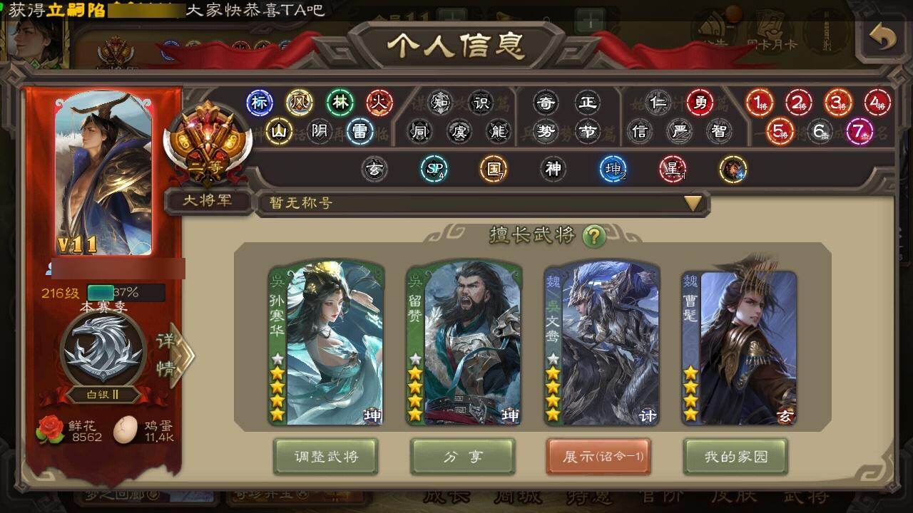 官阶:大将军;VIP等级:VIP11;史诗武将数量:60;动态皮肤数量:45