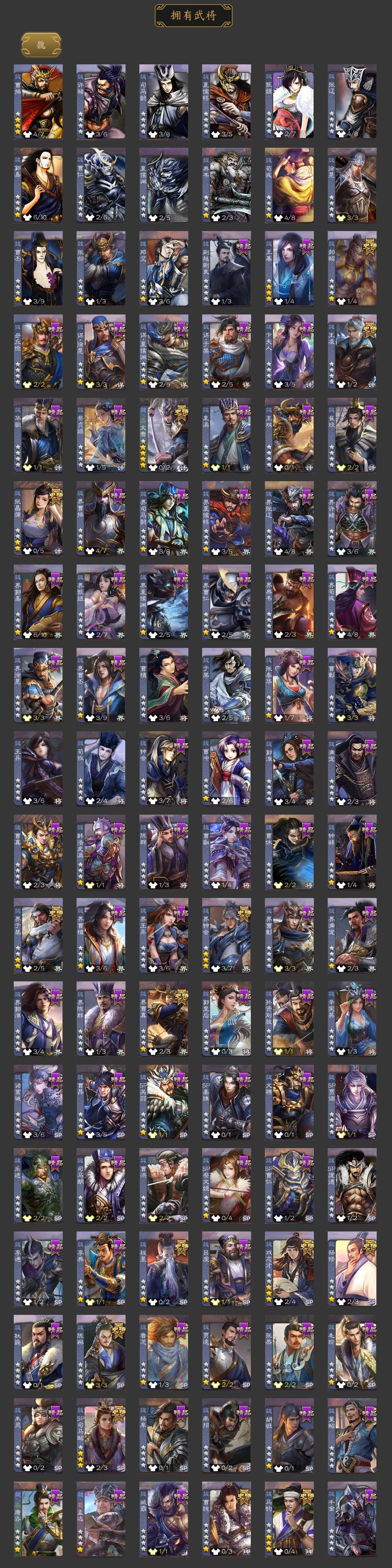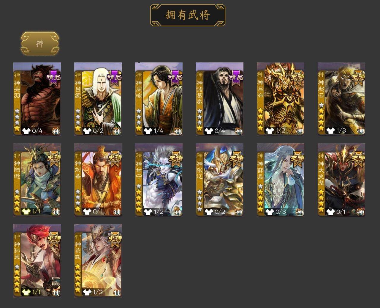 神吕布,神赵云,神陆逊,神刘备,神甘宁,神张辽,神郭嘉,神太史慈,神孙策,神荀彧,神关羽,神吕蒙,神周瑜,神诸葛亮,SP司马昭,张昌蒲,杨修,文鸯,王凌,马钧,界钟会,界于禁,界曹真,郝昭,陈琳,曹纯,戏志才,关索,谋诸葛亮,马云騄,谋黄忠,谋赵云,谋马超,周群,张星彩,王平,