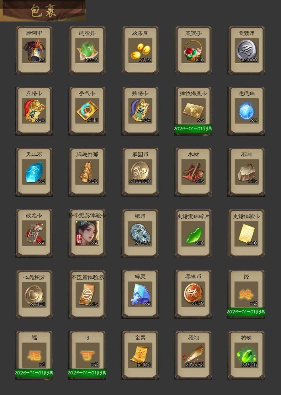 官阶:大将军;VIP等级:VIP14;史诗武将数量:65;动态皮肤数量:40;武将总数:422;史诗宝珠数量:0;将魂数量:1545;神将:14;魏国史诗武将:17;蜀国史诗武将:13;吴国史诗武将:8;群史诗武将:20