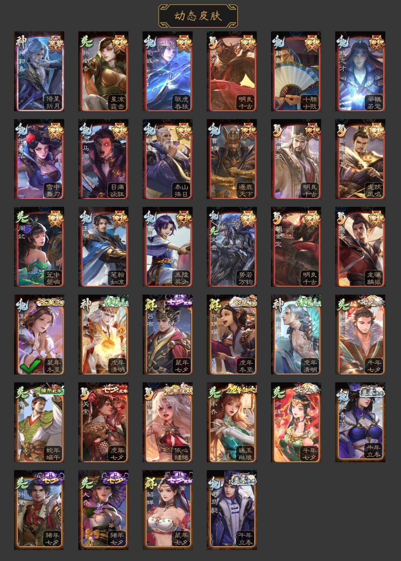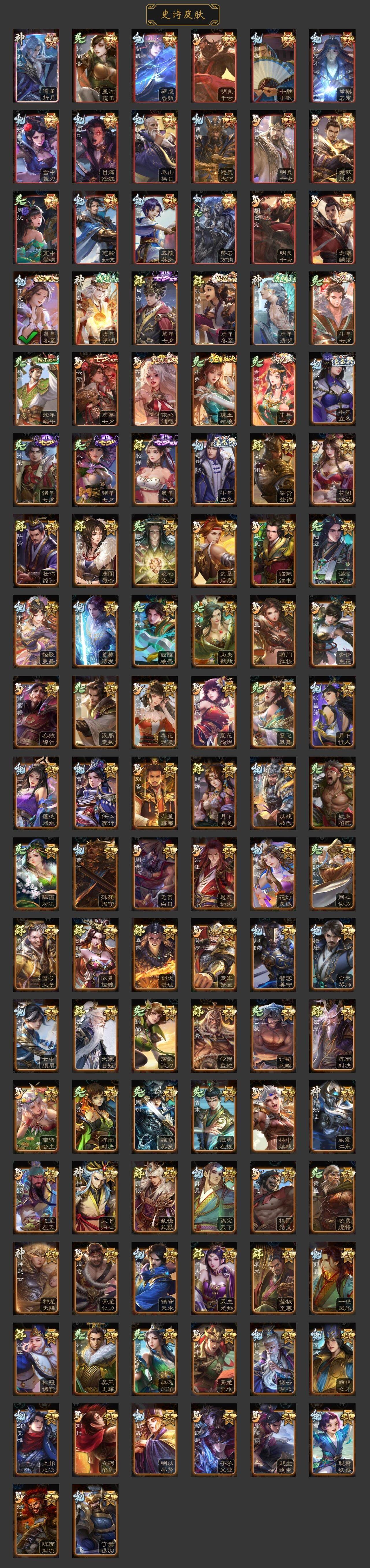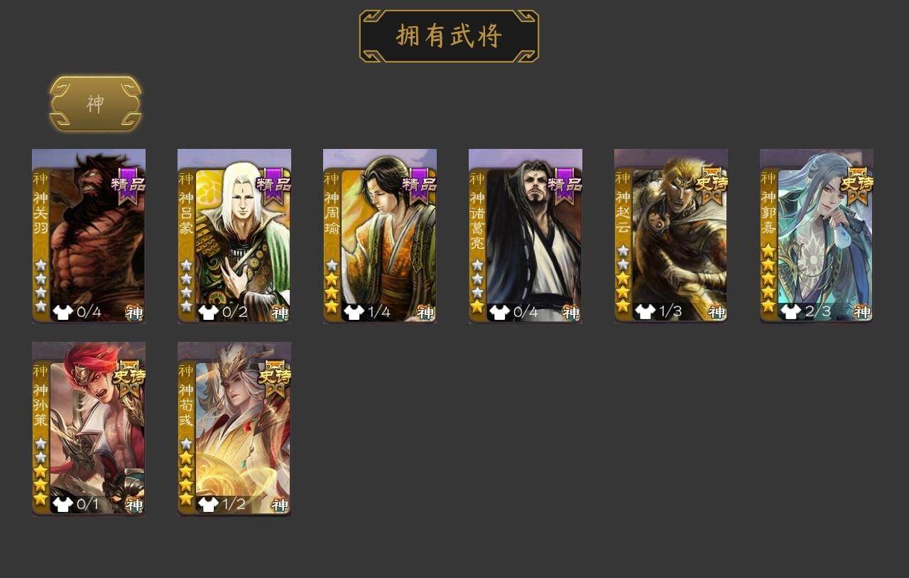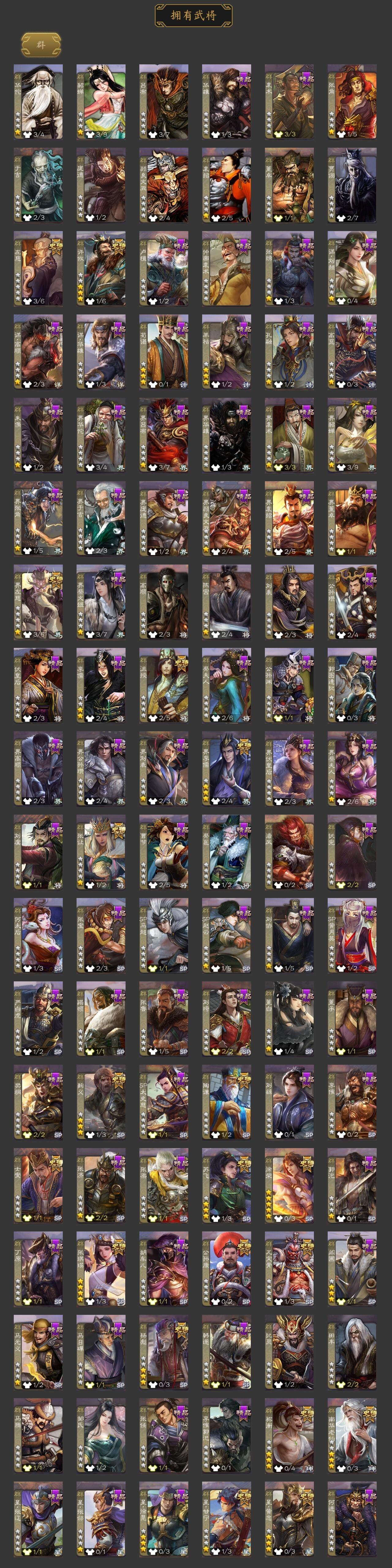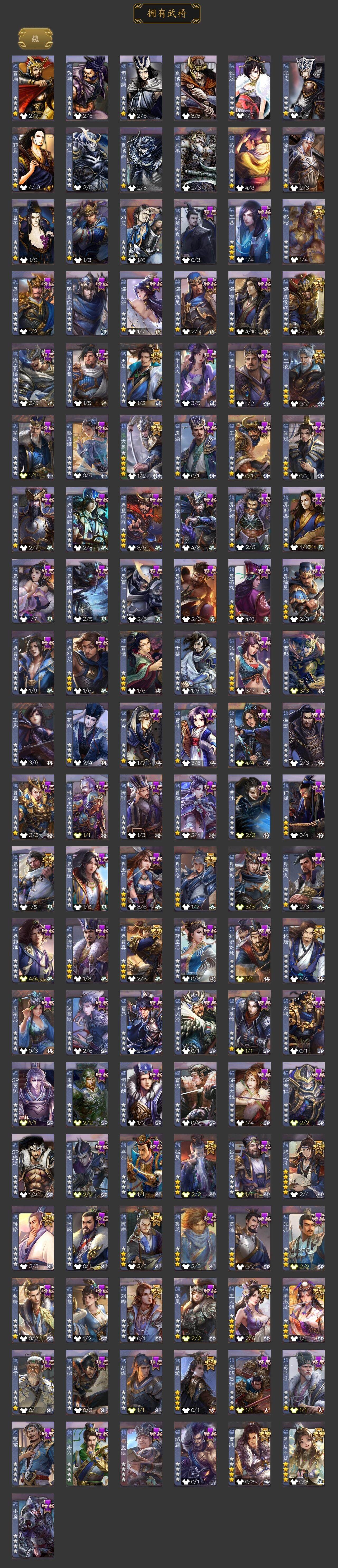 神赵云,神郭嘉,神孙策,神荀彧,神关羽,神吕蒙,神周瑜,神诸葛亮,曹髦,星周不疑,王粲,杨修,羊徽瑜,文鸯,王元姬,王凌,界钟会,界于禁,界曹真,嵇康,郝昭,陈琳,曹纯,戏志才,刘晔,谋夏侯惇,关索,马云騄,谋黄忠,谋夏侯氏,谋赵云,诸葛瞻,赵襄,张星彩,王平,沙摩柯,谯周,界黄