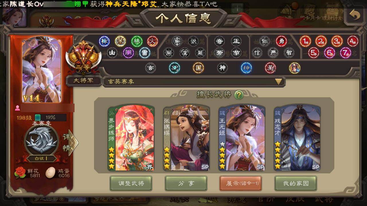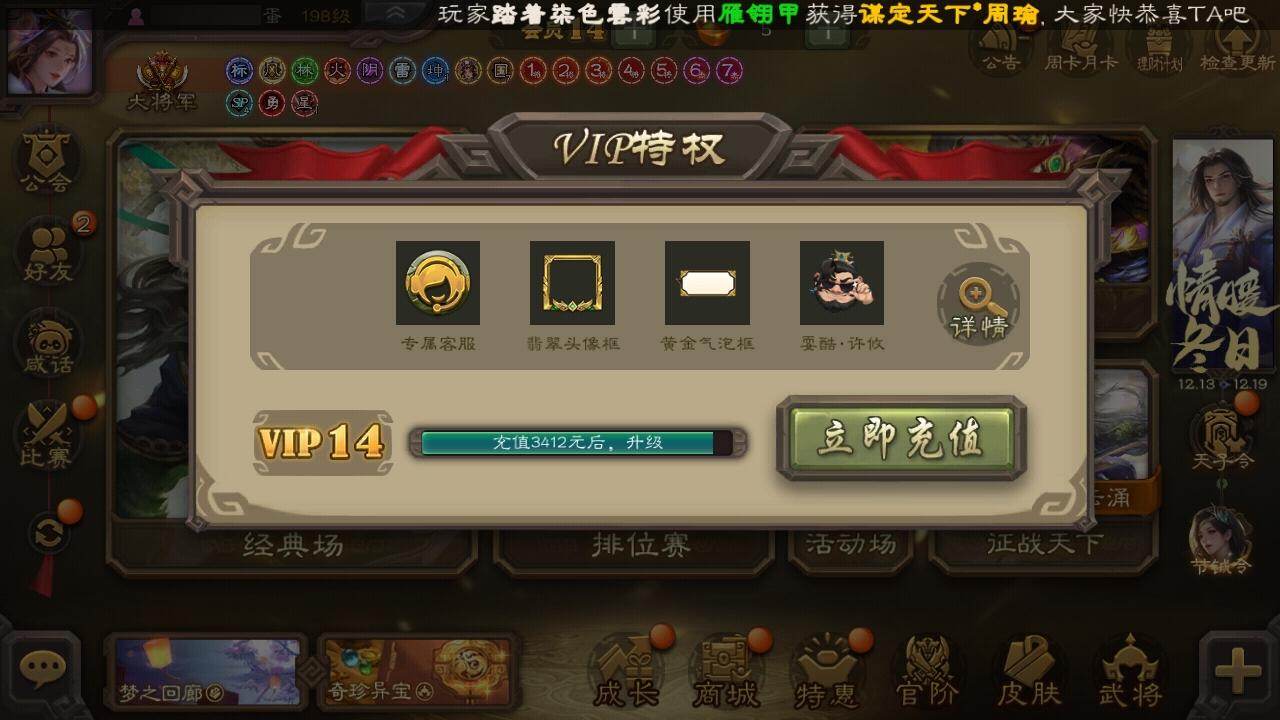 官阶:大将军;VIP等级:VIP14;史诗武将数量:64;动态皮肤数量:27