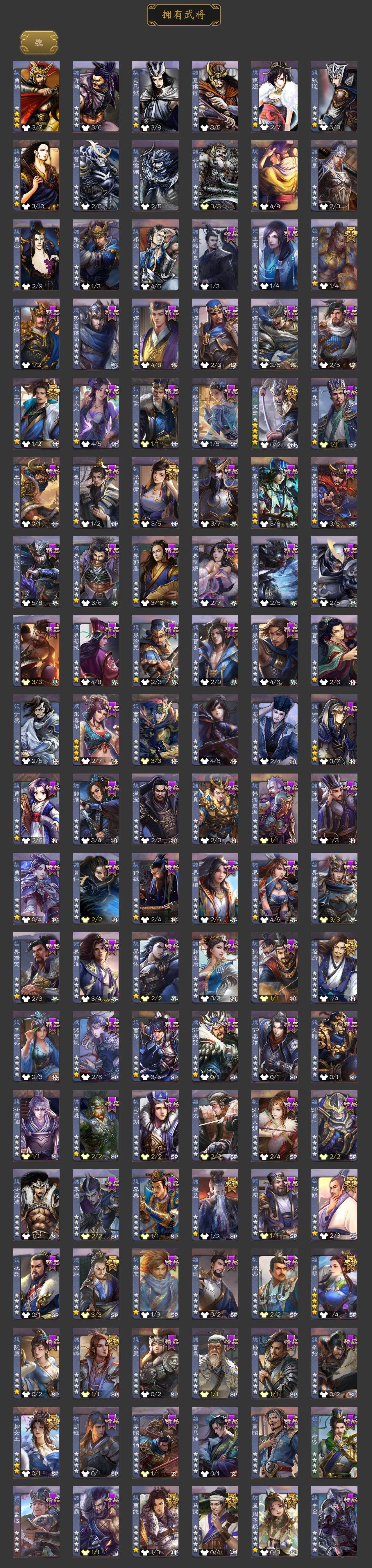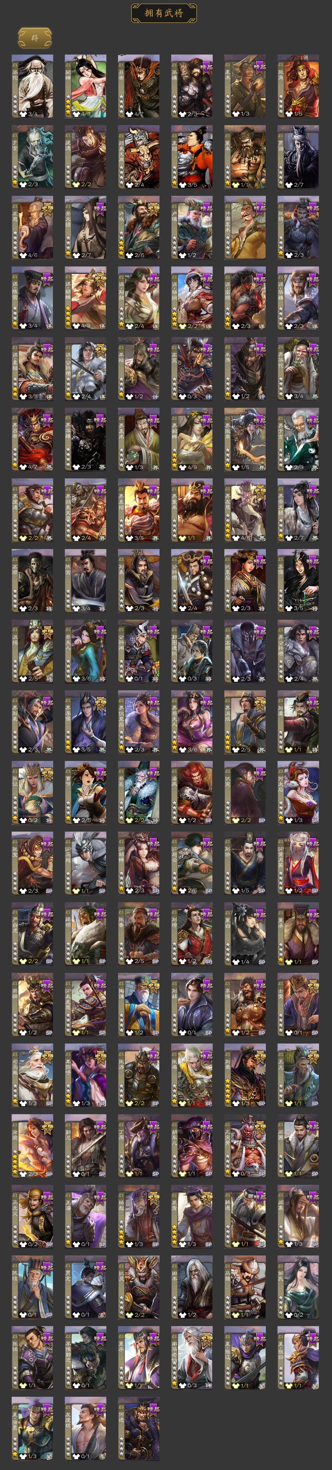 神吕布,神赵云,神甘宁,神太史慈,神孙策,神荀彧,神华佗,神关羽,神吕蒙,神周瑜,神诸葛亮,郭女王,星周不疑,张昌蒲,王粲,杨修,文鸯,马钧,嵇康,郝昭,陈琳,曹婴,曹纯,刘晔,关索,谋诸葛亮,马云騄,谋孙尚香,谋黄忠,谋夏侯氏,谋赵云,谋马超,诸葛瞻,周群,赵襄,张星彩,王平