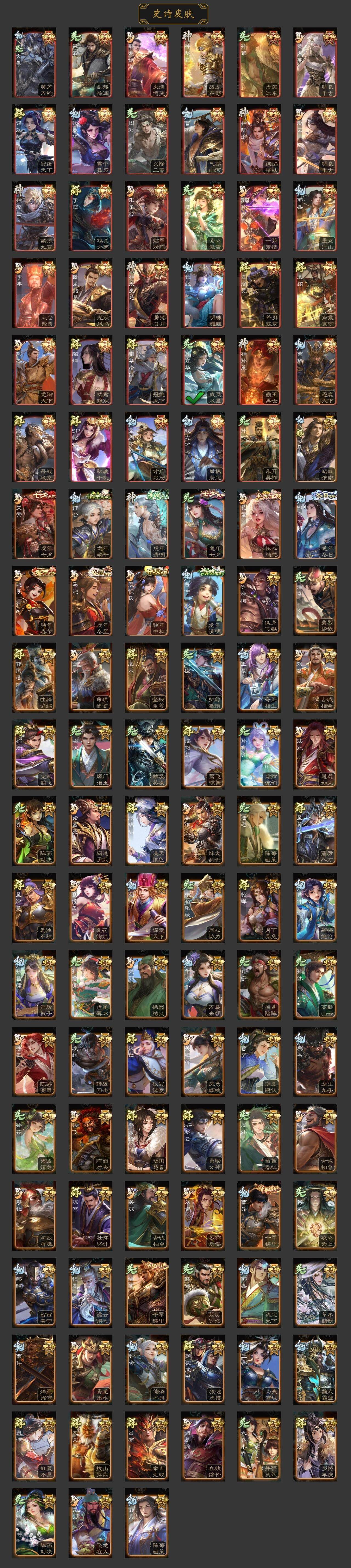 神赵云,神陆逊,神太史慈,神孙策,神吕蒙,神周瑜,曹髦,星周不疑,文鸯,王元姬,魏-司马昭,界钟会,曹纯,戏志才,关索,谋夏侯氏,谋赵云,谋马超,赵襄,张星彩,王平,沙摩柯,谯周,花鬘,吴景,孙寒华,骆统,界朱然,界徐盛,势陆郁生,谋黄月英,裴秀,左慈,张让,张琪瑛,星黄忠,星甘