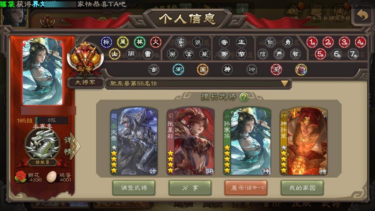 官阶:大将军;VIP等级:VIP10;史诗武将数量:42;动态皮肤数量:44;武将总数:362;史诗宝珠数量:4;将魂数量:3032;神将:6;魏国史诗武将:18;蜀国史诗武将:10;吴国史诗武将:6;群史诗武将:15