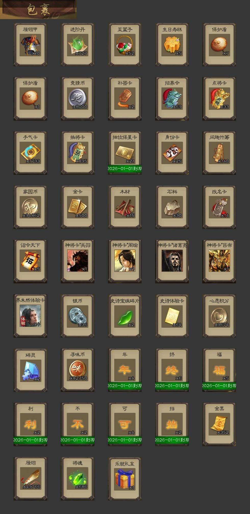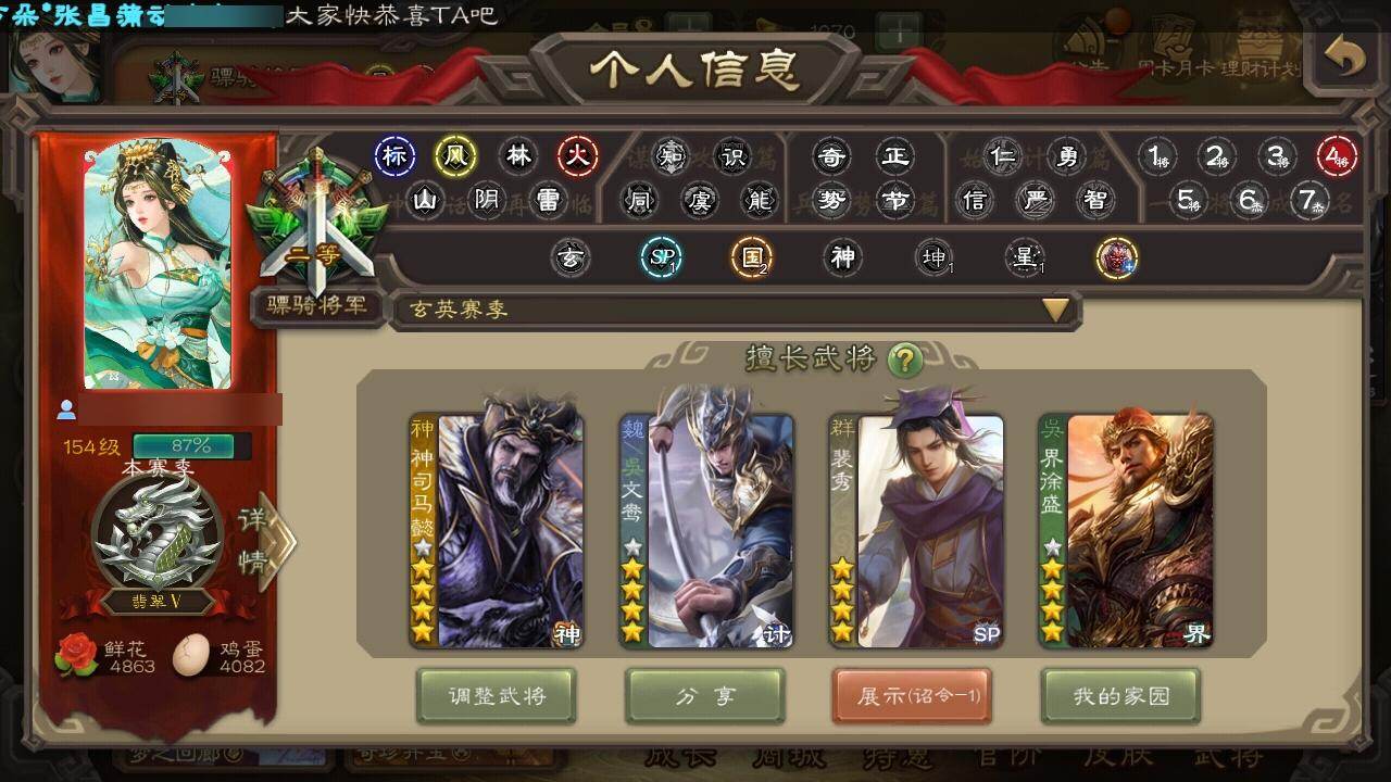 官阶:骠骑将军;VIP等级:VIP8;史诗武将数量:27;动态皮肤数量:21
