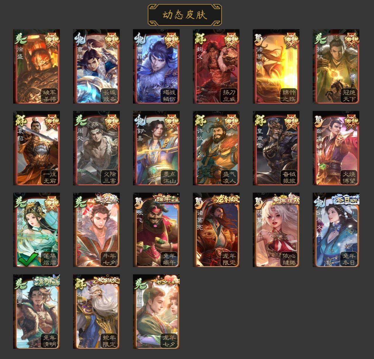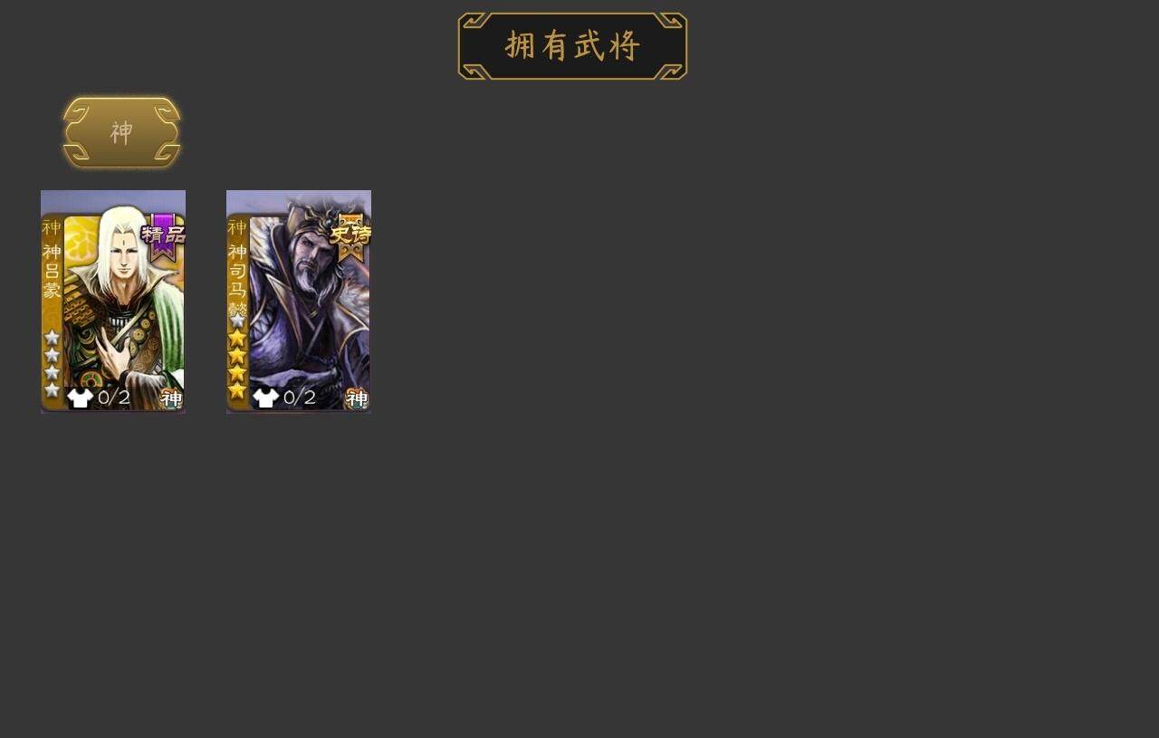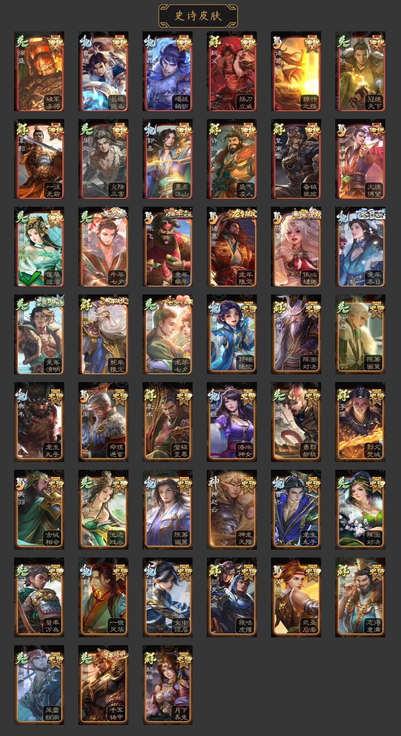 神司马懿,神吕蒙,星周不疑,文鸯,王元姬,界钟会,曹纯,戏志才,谋赵云,诸葛瞻,沙摩柯,界黄忠,花鬘,董允,骆统,留赞,界徐盛,界步练师,裴秀,星甘宁,麹义,沮授,界左慈,公孙康,鲍信,谋张角,张绣,许攸,神赵云-神龙天降,SP蔡文姬-兔年冬日(动态),曹昂-竭战麟伤(动态),曹纯-长