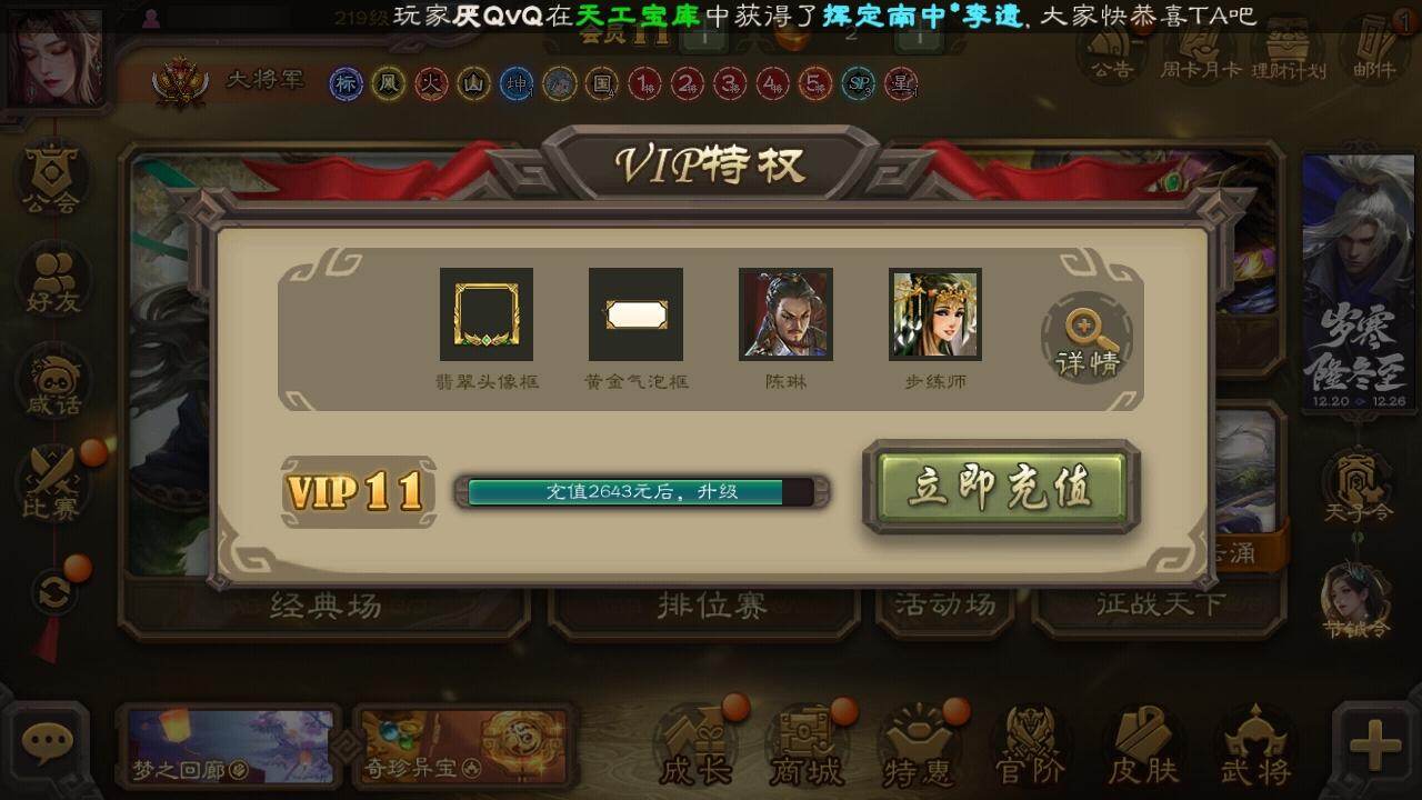 官阶:大将军;VIP等级:VIP11;史诗武将数量:39;动态皮肤数量:33
