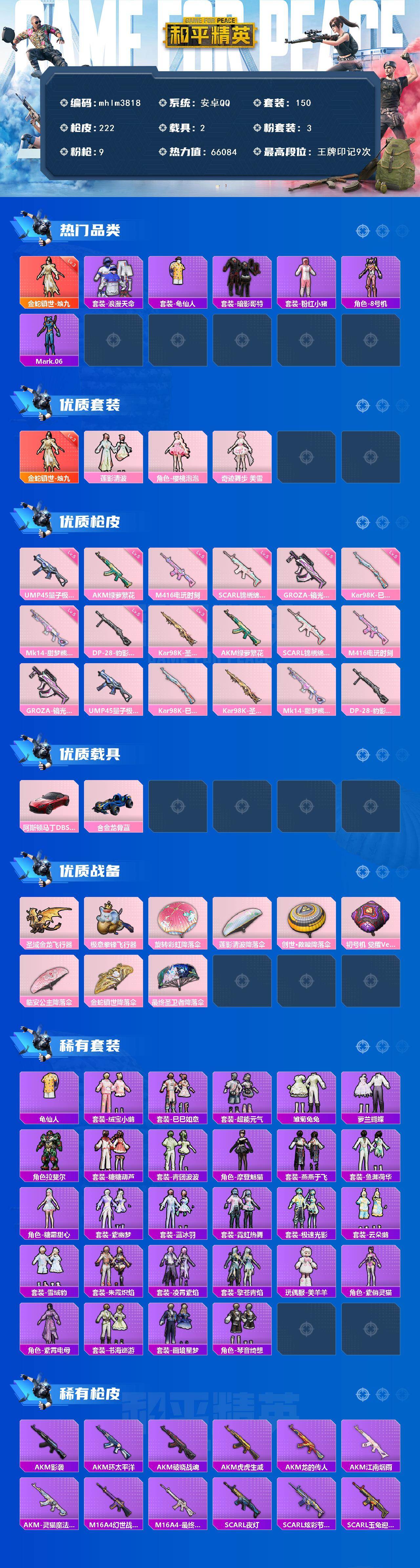 安卓 手Q-1神装-3粉装-9特效枪-2载具-3粉色飞行器-66084热力值-9王牌印记-150套装-222枪皮