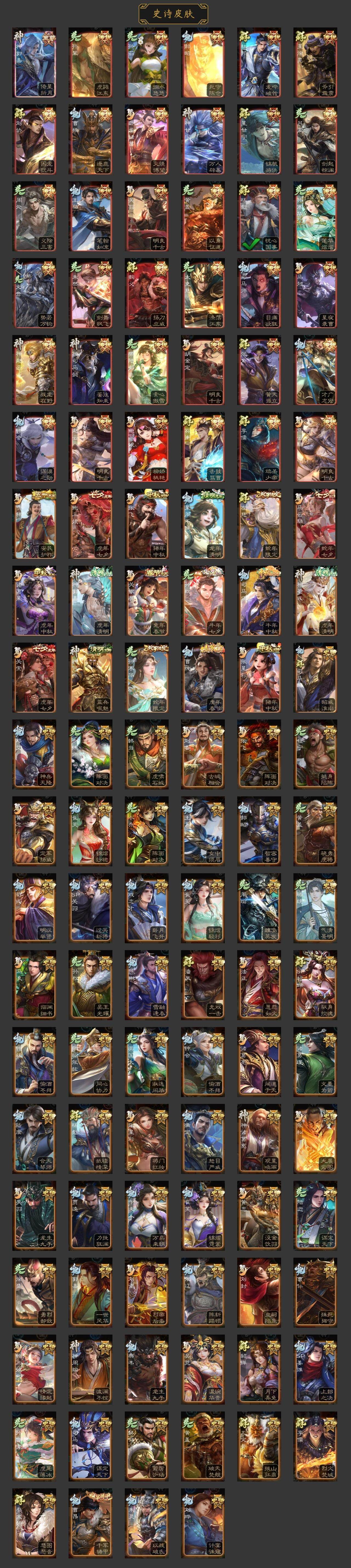 神吕布,神赵云,神司马懿,神陆逊,神刘备,神甘宁,神张辽,神郭嘉,神太史慈,神孙策,神荀彧,神吕蒙,神周瑜,星周不疑,张昌蒲,杨修,文鸯,魏-司马昭,界钟会,界曹真,嵇康,郝昭,曹婴,曹纯,戏志才,关索,谋诸葛亮,马云騄,谋黄忠,谋赵云,谋马超,周群,张星彩,谯周,界黄忠,花鬘,