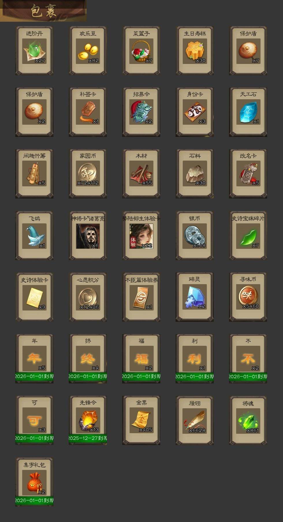 官阶:大将军;VIP等级:VIP12;史诗武将数量:61;动态皮肤数量:47;武将总数:397;史诗宝珠数量:0;将魂数量:861;神将:13;魏国史诗武将:23;蜀国史诗武将:13;吴国史诗武将:8;群史诗武将:16