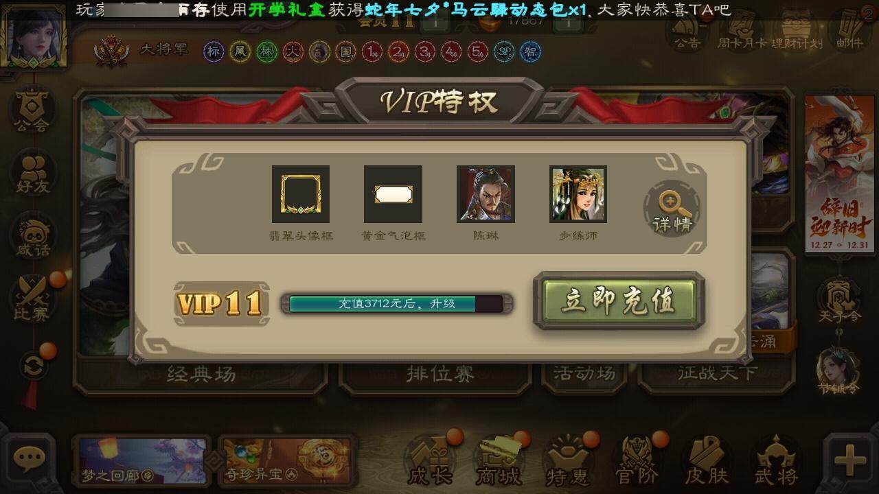 官阶:大将军;VIP等级:VIP11;史诗武将数量:53;动态皮肤数量:39