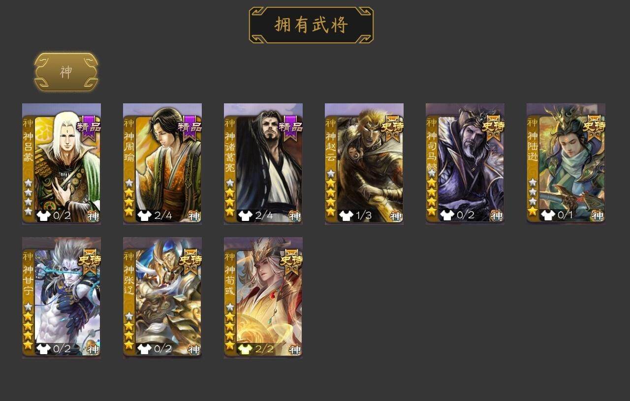 神赵云,神司马懿,神陆逊,神甘宁,神张辽,神荀彧,神吕蒙,神周瑜,神诸葛亮,王粲,杨修,文鸯,界钟会,嵇康,陈琳,曹纯,戏志才,刘晔,清河公主,蒋济,关索,马云騄,谋孙尚香,谋赵云,张星彩,沙摩柯,谯周,傅佥,花鬘,董允,谋黄盖,吴景,孙皓,孙寒华,骆统,界朱然,界徐盛,界步练