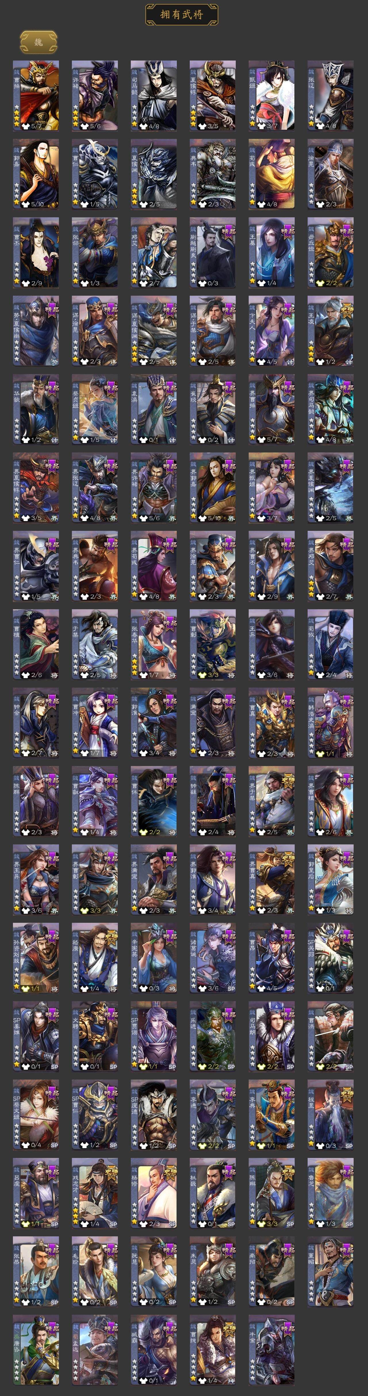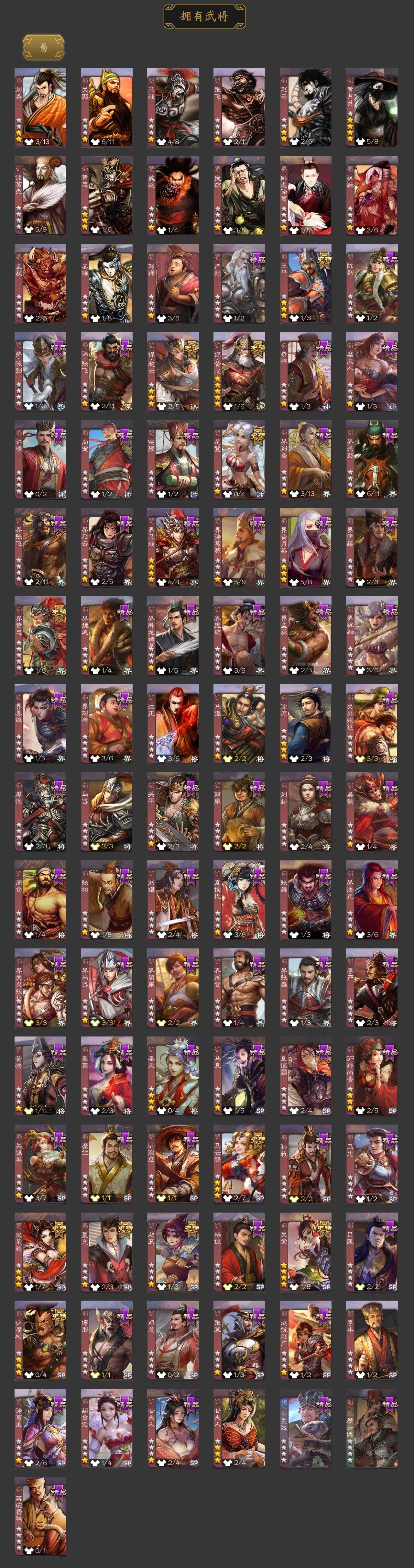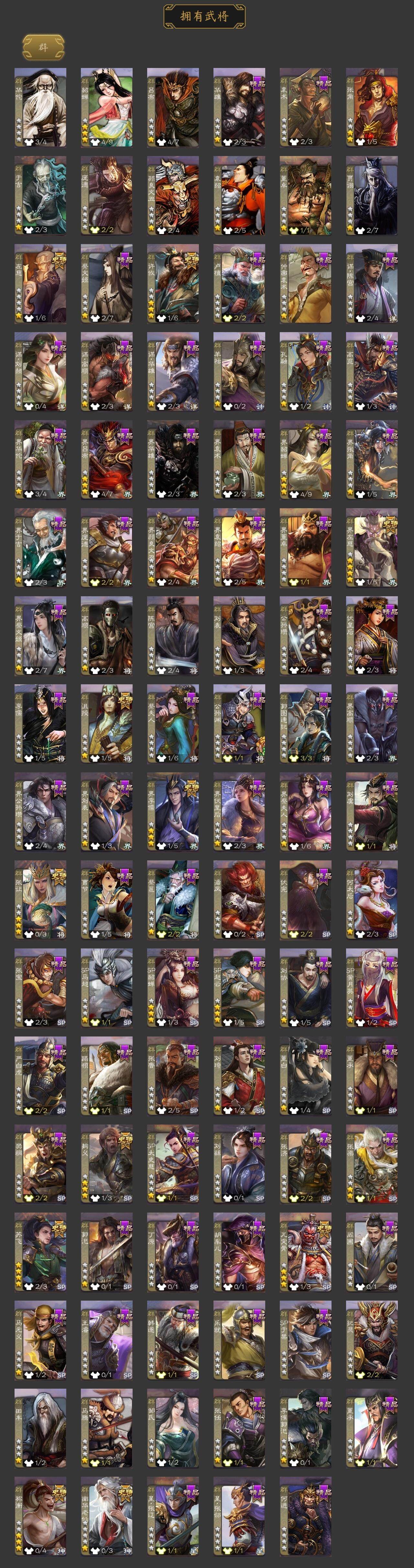 神刘备,神甘宁,神张辽,神郭嘉,神太史慈,神孙策,神荀彧,杨修,王凌,界于禁,界曹真,嵇康,陈琳,曹纯,戏志才,程昱,关索,马云騄,谋黄忠,谋赵云,赵襄,张星彩,王平,沙摩柯,界黄忠,花鬘,董允,周处,吴景,孙寒华,骆统,留赞,界朱然,界徐盛,界步练师,贺齐,左慈,张让,苏飞,麹义,