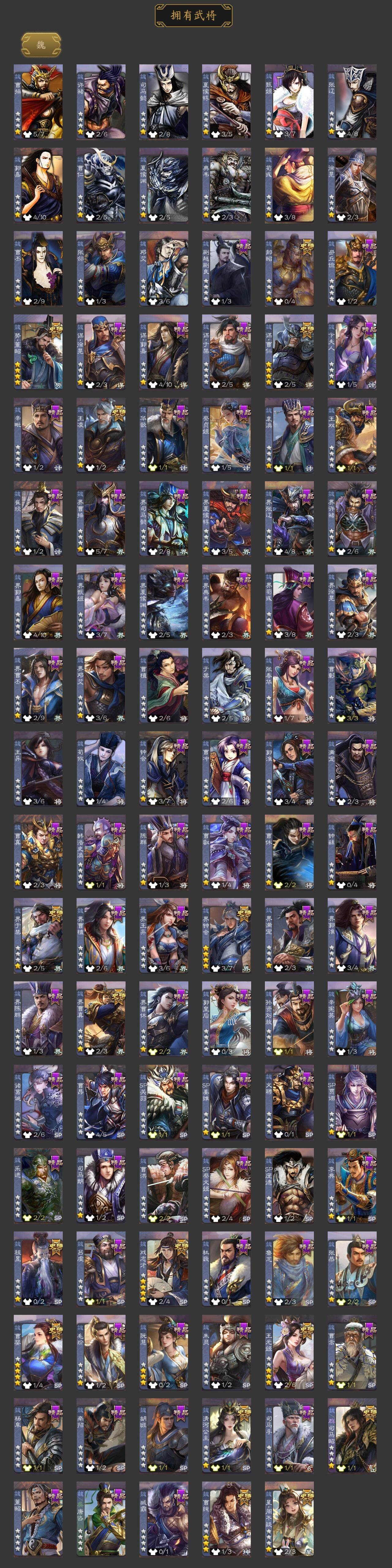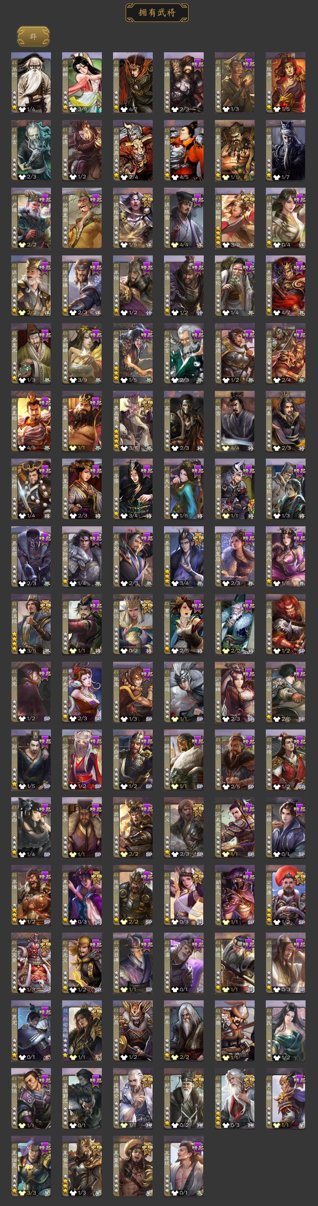 神吕布,神赵云,神司马懿,神陆逊,神甘宁,神张辽,神吕蒙,神周瑜,星周不疑,谋曹仁,王元姬,王凌,魏-司马昭,界钟会,界于禁,界曹真,郝昭,曹婴,曹纯,戏志才,势董昭,清河公主,谋赵云,谋马超,诸葛瞻,赵襄,沙摩柯,谯周,花鬘,董允,孙寒华,界徐盛,贺齐,谋郭嘉,谋貂蝉,界沮授,郑玄