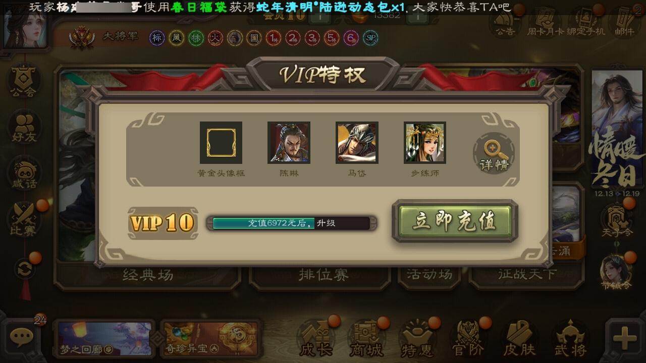 官阶:大将军;VIP等级:VIP10;史诗武将数量:48;动态皮肤数量:46