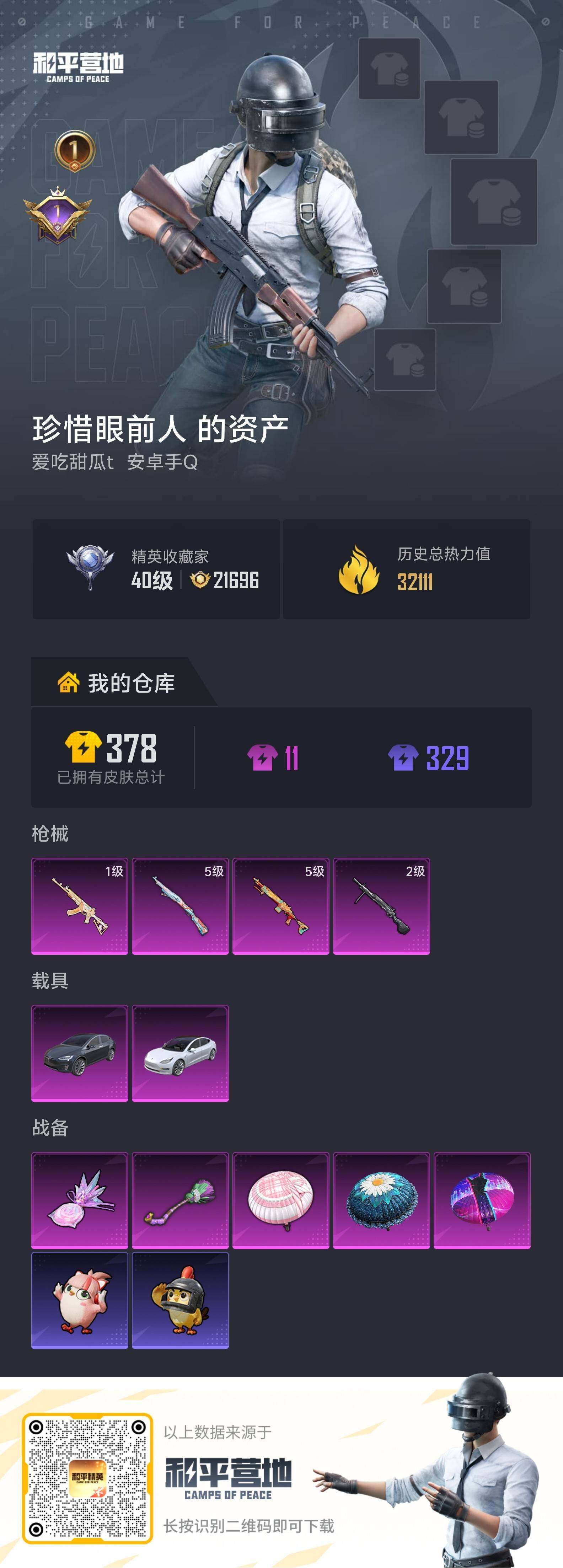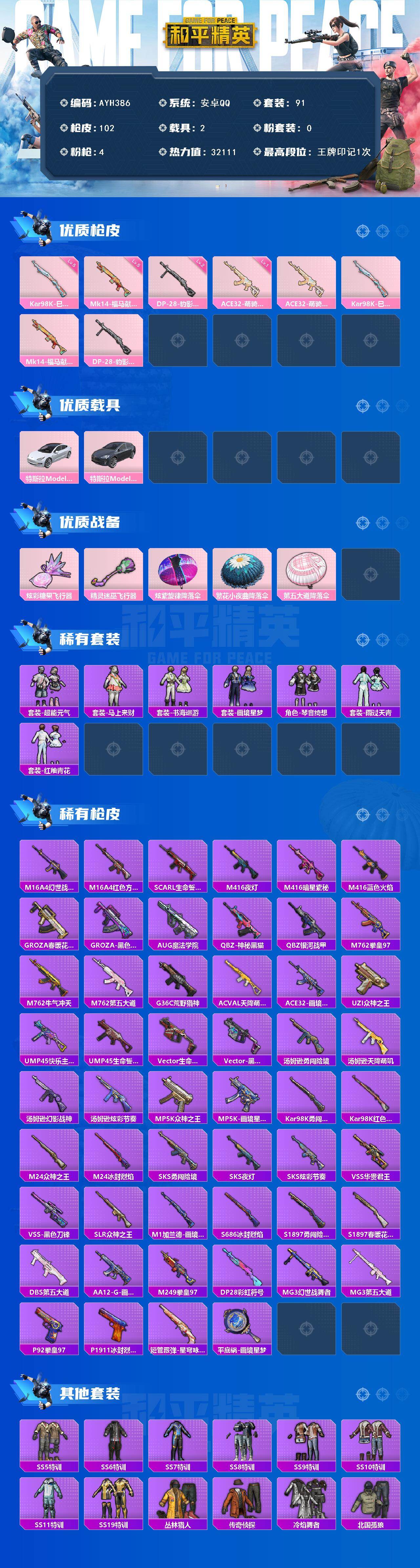 【店主推荐捡漏号】安卓 手Q-0粉装-4特效枪-2载具-2粉色飞行器-32111热力值-1王牌印记-91套装-102枪皮【粉色枪皮等级】:ACE32-萌骑漫游(一级),Kar98K-巳巳如意(五级),Mk14-福马献瑞(五级),DP-28-豹影疾电(二级)【粉色载具】:特斯拉Model 3(珍珠白),特斯拉Model X(冷光银)【粉色枪皮】:ACE32-萌骑漫游,Kar98K-巳巳如意,Mk14-福马献瑞,DP-28-豹影疾电