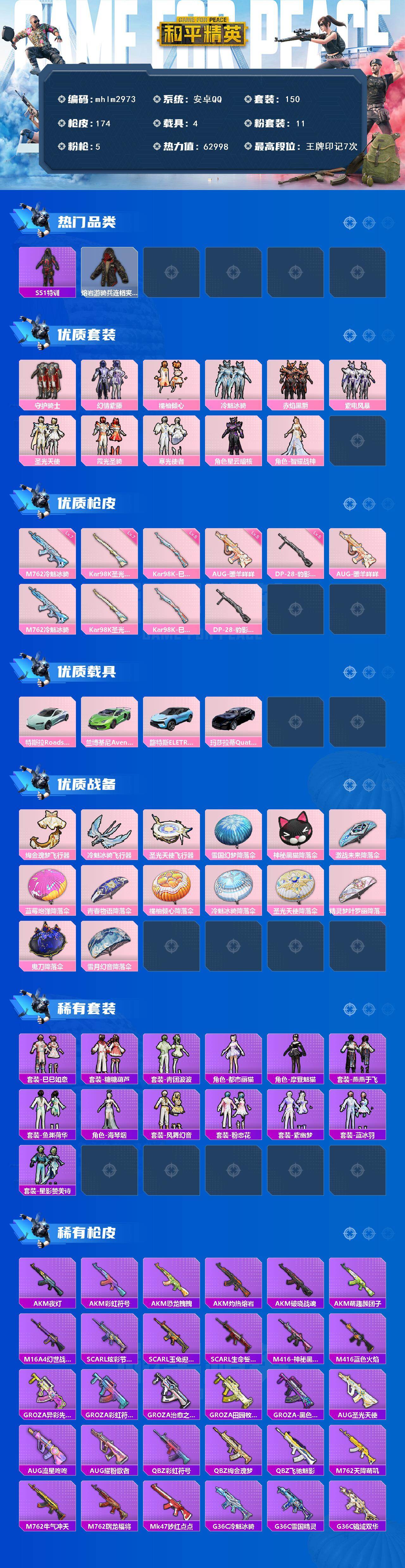 安卓 手Q-11粉装-5特效枪-4载具-4粉色飞行器-62998热力值-7王牌印记-150套装-174枪皮
