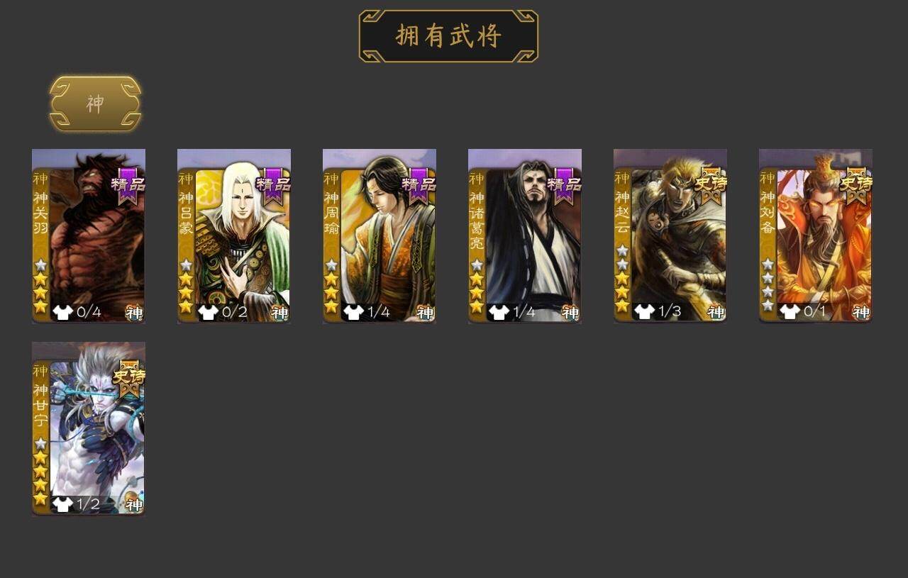 神赵云,神刘备,神甘宁,神关羽,神吕蒙,神周瑜,神诸葛亮,曹髦,星周不疑,王粲,王元姬,魏-司马昭,界钟会,曹纯,戏志才,清河公主,谋赵云,谋马超,诸葛瞻,张星彩,沙摩柯,谯周,界黄忠,花鬘,孙寒华,骆统,留赞,界徐盛,谋郭嘉,谋公孙瓒,裴秀,左慈,张让,张琪瑛,南华老仙,沮授,