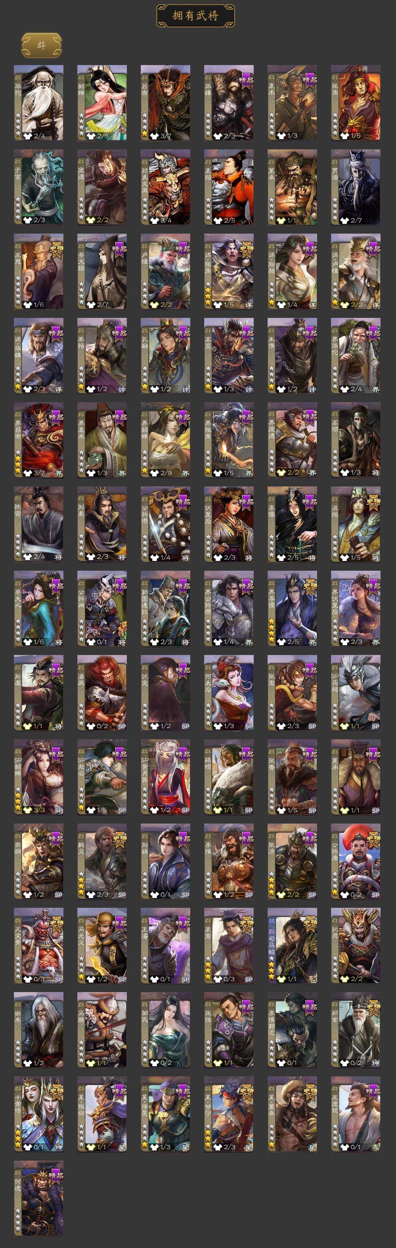 神吕布,神赵云,神陆逊,神孙策,星周不疑,谋曹仁,王元姬,界钟会,界于禁,郝昭,曹婴,曹纯,戏志才,程昱,谋赵云,谋马超,诸葛瞻,赵襄,沙摩柯,董允,谋关羽,吴景,孙皓,孙寒华,界徐盛,界步练师,势太史慈,文鸯,十常侍,裴秀,左慈,郑玄,星甘宁,麹义,沮授,界李儒,公孙康,谋张角,星