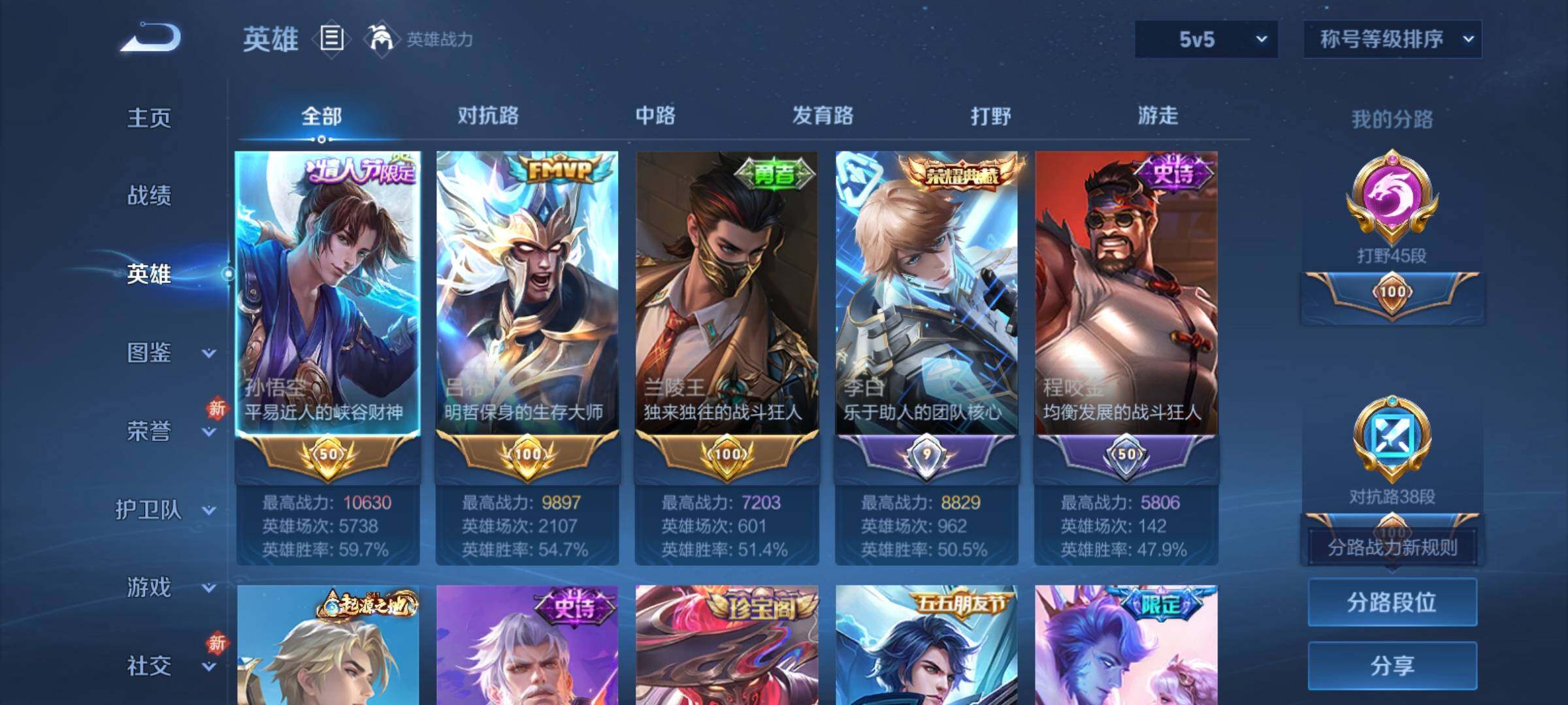 可换绑【店铺主推·打野45段·金标万战孙悟空·吕布兰陵王·貂蝉慕夏·李白孙悟空