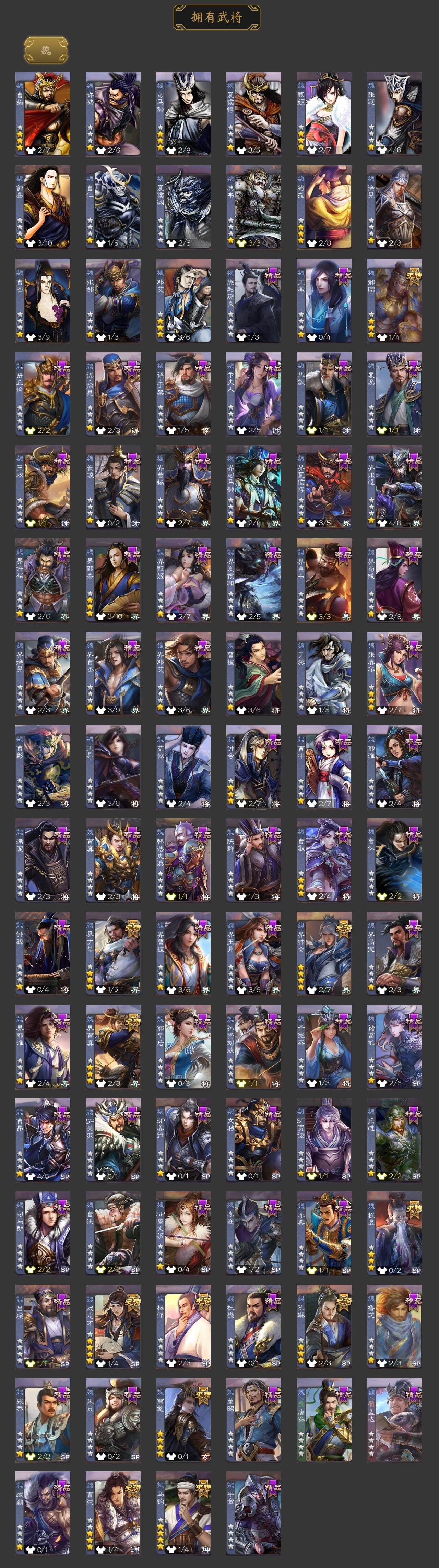 神赵云,神甘宁,神郭嘉,神太史慈,神孙策,神荀彧,神诸葛亮,曹髦,杨修,马钧,界钟会,界于禁,界曹真,郝昭,陈琳,曹纯,戏志才,程昱,谋诸葛亮,谋赵云,赵襄,沙摩柯,谯周,界黄忠,花鬘,周处,留赞,界朱然,界徐盛,左慈,张让,星黄忠,星甘宁,苏飞,南华老仙,祢衡,界左慈,界李儒,公