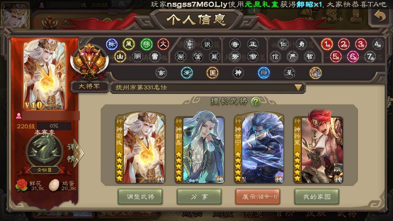官阶:大将军;VIP等级:VIP10;史诗武将数量:40;动态皮肤数量:18