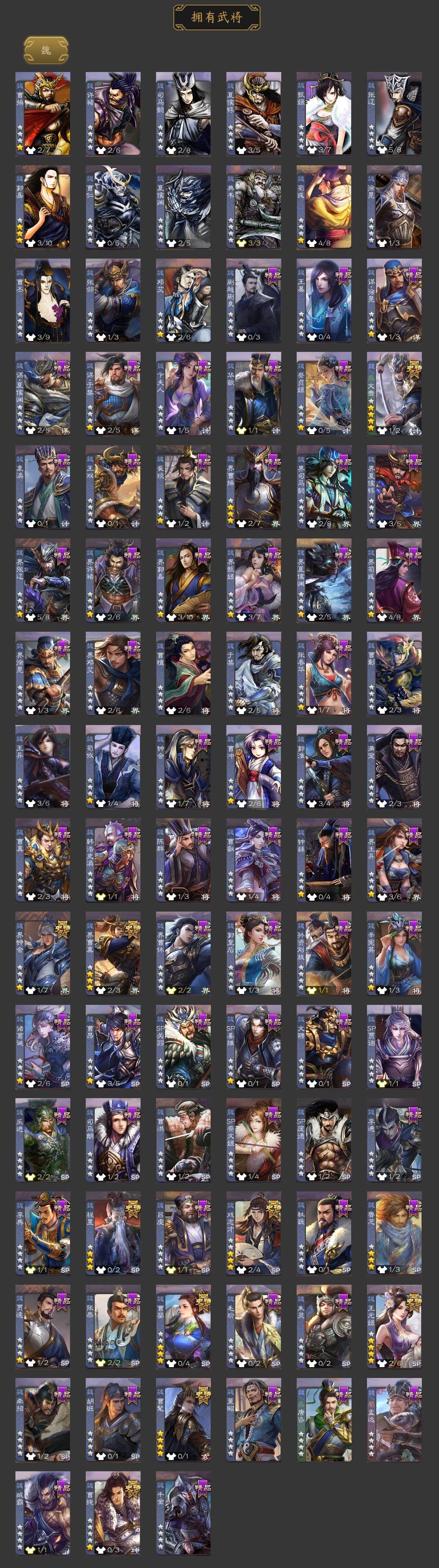 官阶:骠骑将军;VIP等级:VIP9;史诗武将数量:30;动态皮肤数量:22;武将总数:322;史诗宝珠数量:6;将魂数量:1255;神将:5;魏国史诗武将:11;蜀国史诗武将:8;吴国史诗武将:4;群史诗武将:7