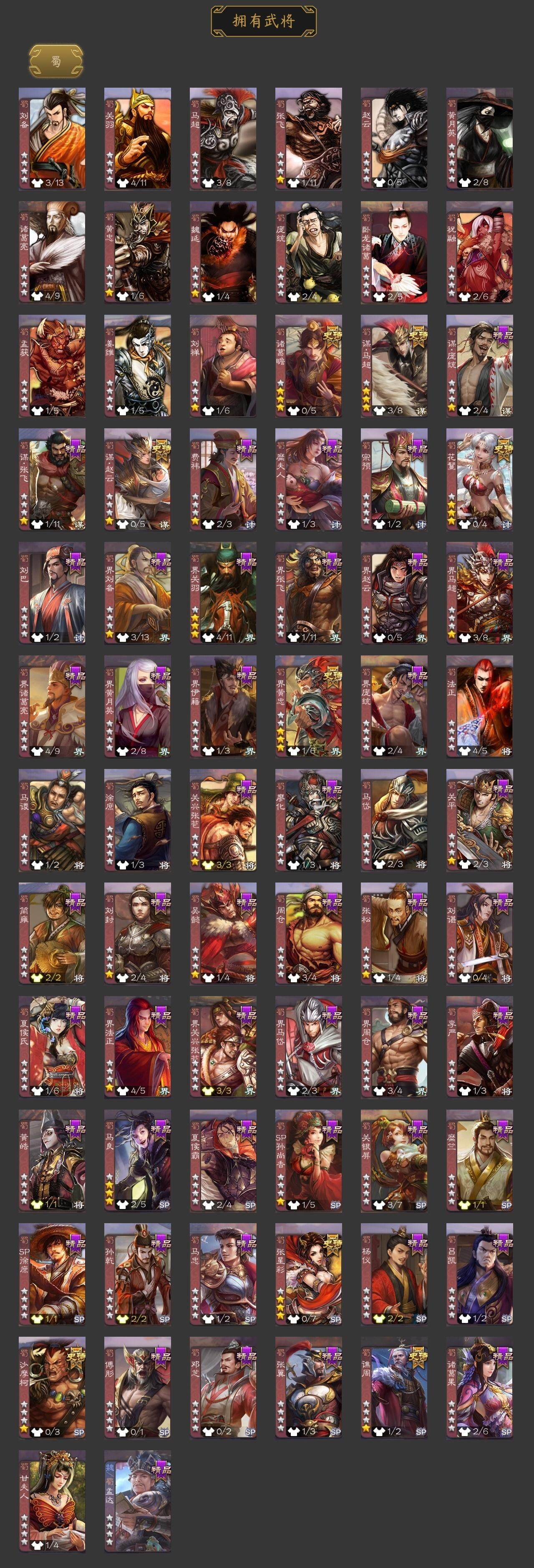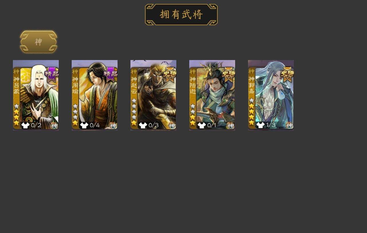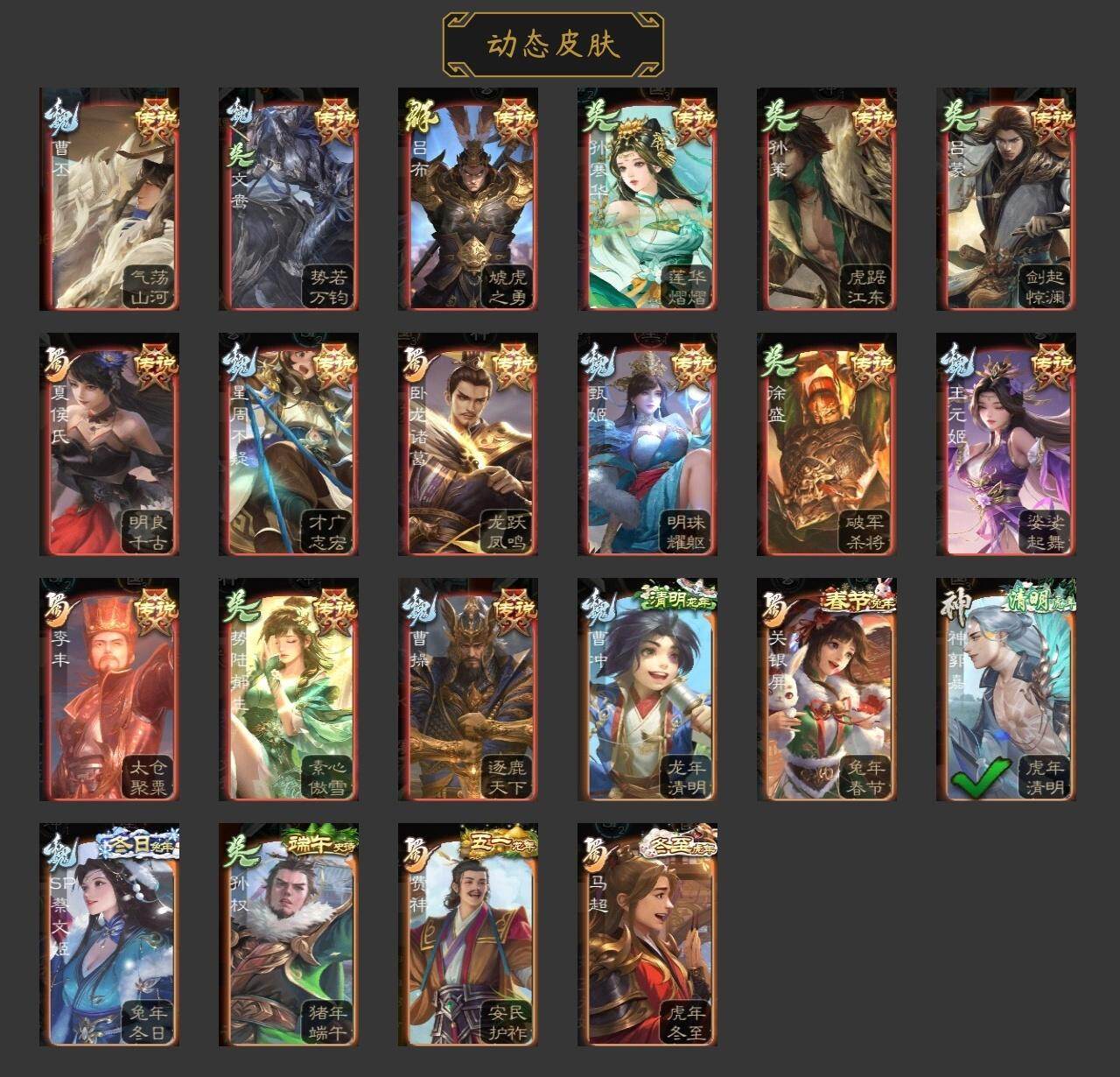 神赵云,神陆逊,神郭嘉,神吕蒙,神周瑜,曹髦,文鸯,王元姬,界钟会,界曹真,曹婴,曹纯,戏志才,谋赵云,谋马超,诸葛瞻,张星彩,沙摩柯,谯周,界黄忠,花鬘,骆统,界朱然,界徐盛,势陆郁生,左慈,审配,南华老仙,谋张角,张绣,李傕,许攸,神张辽-威震江东,神郭嘉-虎年清明(动态),王元