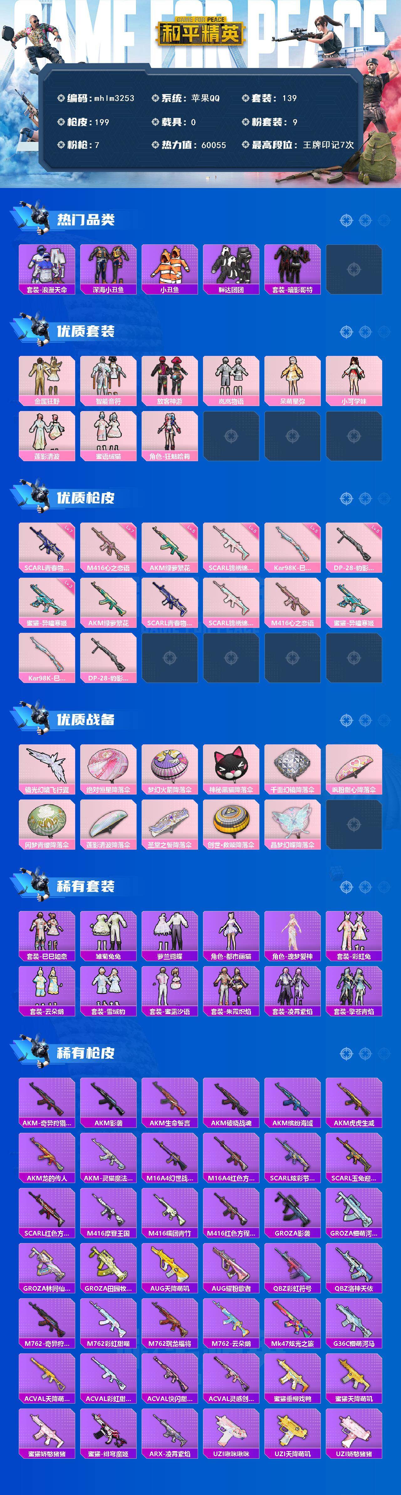 苹果 手Q-9粉装-7特效枪-0载具-2粉色飞行器-60055热力值-7王牌印记-139套装-199枪皮