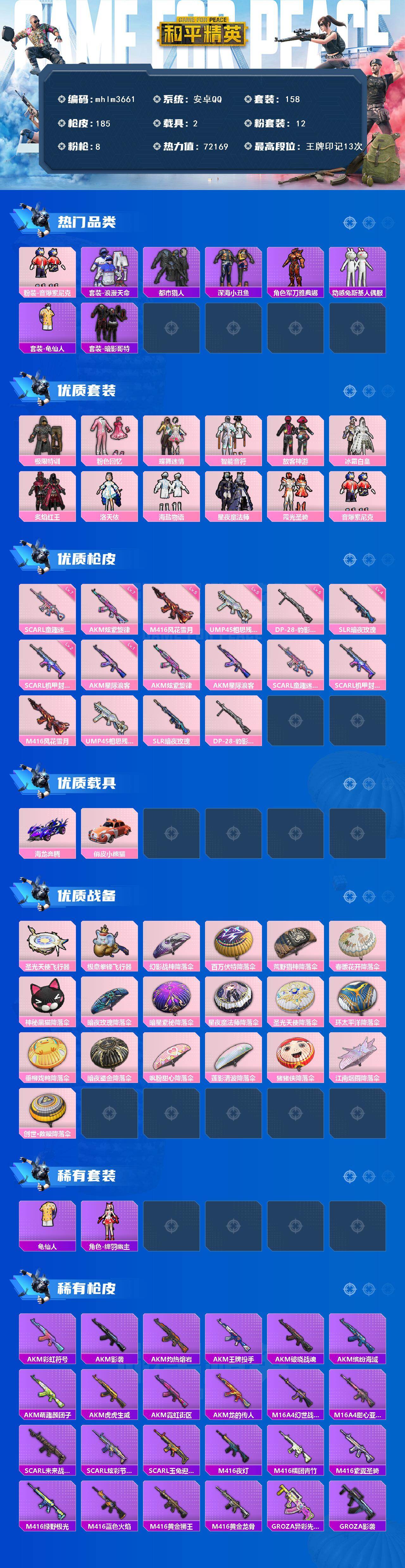 安卓 手Q-12粉装-8特效枪-2载具-3粉色飞行器-72169热力值-13王牌印记-158套装-185枪皮