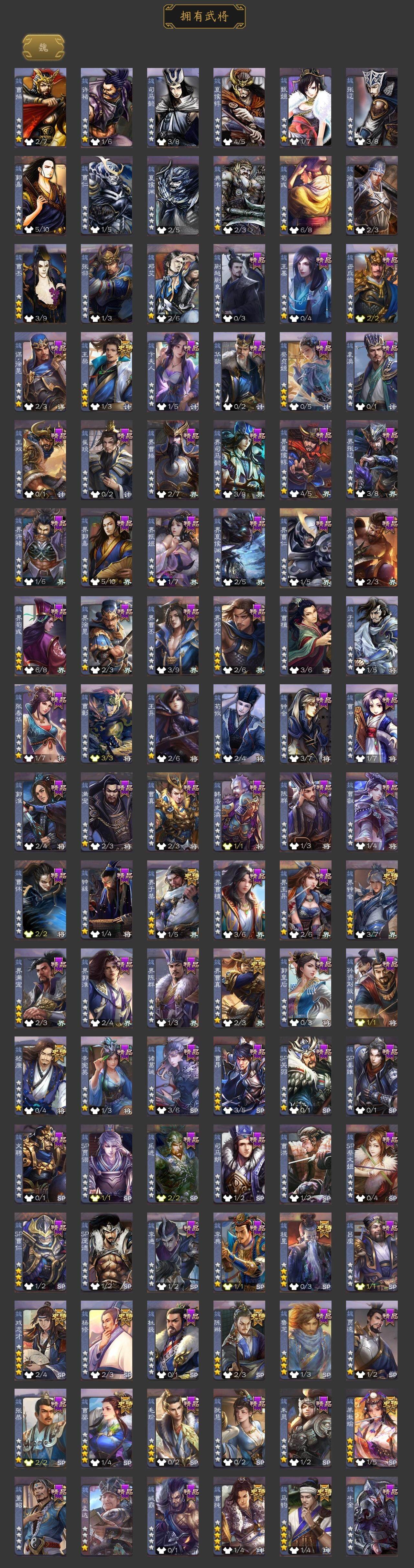 官阶:大将军;VIP等级:VIP12;史诗武将数量:54;动态皮肤数量:35;武将总数:397;史诗宝珠数量:2;将魂数量:622;神将:8;魏国史诗武将:24;蜀国史诗武将:12;吴国史诗武将:7;群史诗武将:15