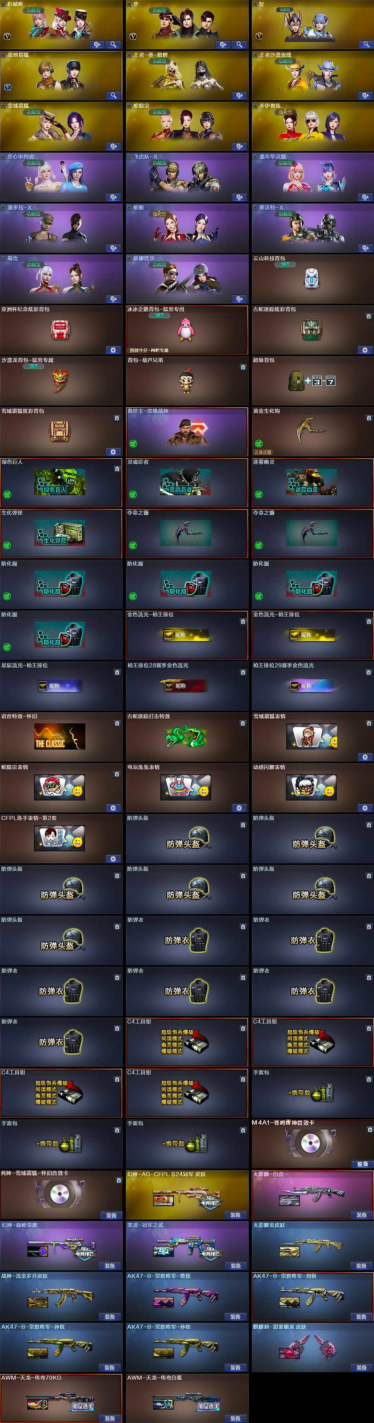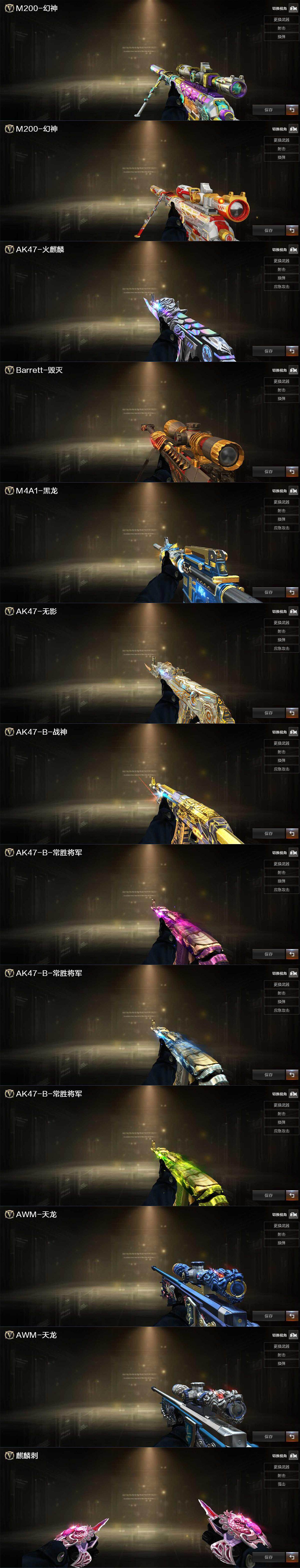 【皮肤】:幻神-巅峰荣耀,幻神-AG-CFPL S24冠军 皮肤,火麒麟-白虎,毁灭-英雄计划 皮肤,黑龙-冠军之武,无影耀金皮肤,战神-流金岁月皮肤,AK47-B-常胜将军-曹操,AK47-B-常胜将军-刘备,AK
