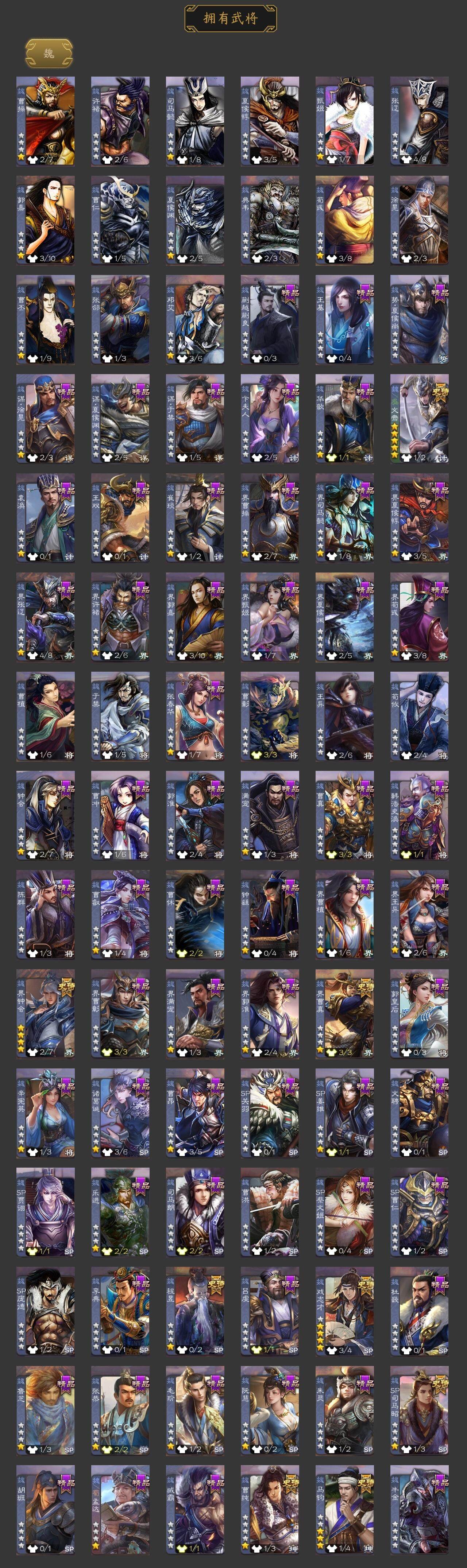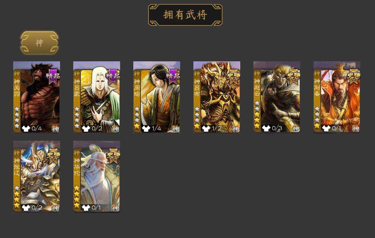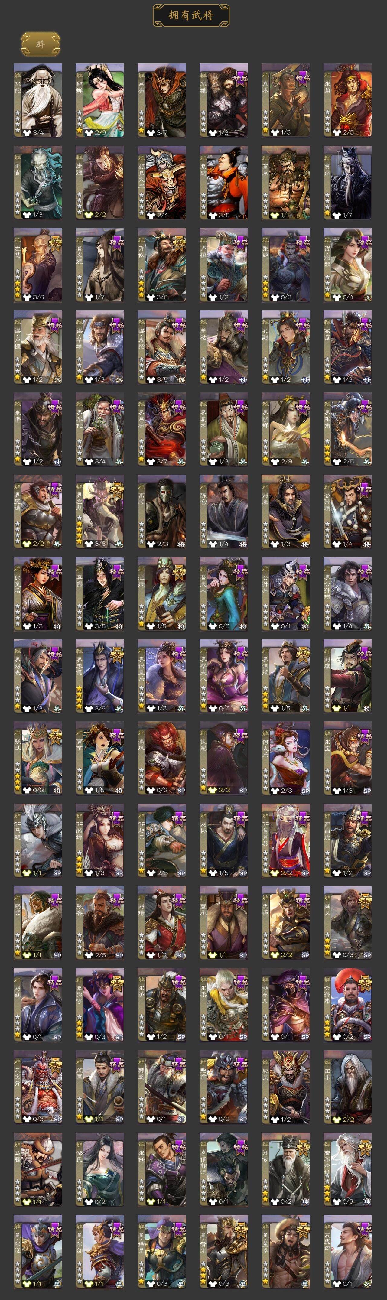 神吕布,神赵云,神刘备,神张辽,神华佗,神关羽,神吕蒙,神周瑜,SP司马昭,文鸯,马钧,界钟会,界曹真,曹纯,戏志才,谋夏侯氏,谋马超,诸葛瞻,界黄忠,花鬘,董允,谋黄盖,周处,吴景,骆统,界朱然,界徐盛,谋黄月英,界沮授,左慈,郑玄,张让,星黄忠,麹义,南华老仙,沮授,界左慈,