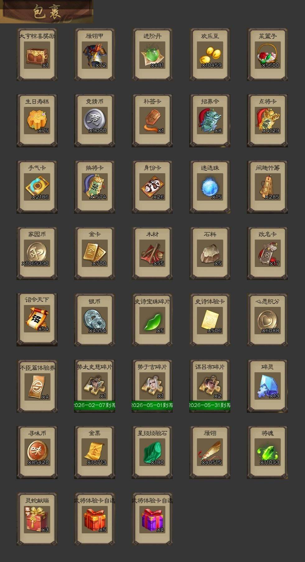 官阶:大将军;VIP等级:VIP10;史诗武将数量:40;动态皮肤数量:33;武将总数:358;史诗宝珠数量:0;将魂数量:11093;神将:8;魏国史诗武将:18;蜀国史诗武将:6;吴国史诗武将:6;群史诗武将:17