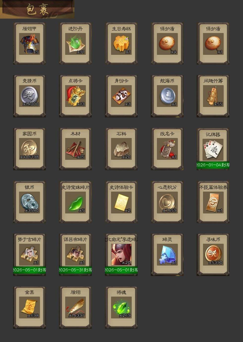 官阶:大将军;VIP等级:VIP13;史诗武将数量:64;动态皮肤数量:40;武将总数:436;史诗宝珠数量:0;将魂数量:269;神将:10;魏国史诗武将:19;蜀国史诗武将:12;吴国史诗武将:11;群史诗武将:20