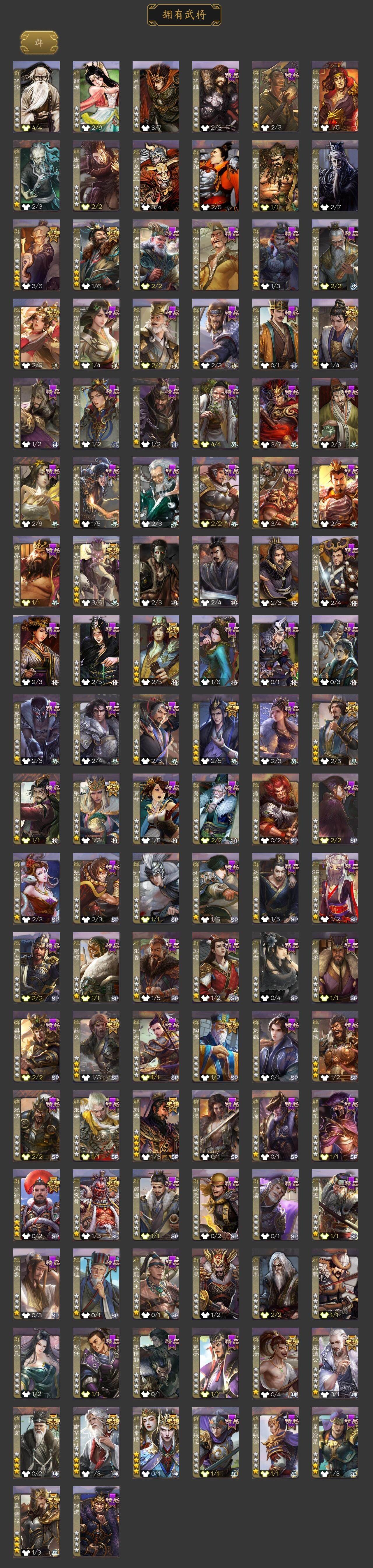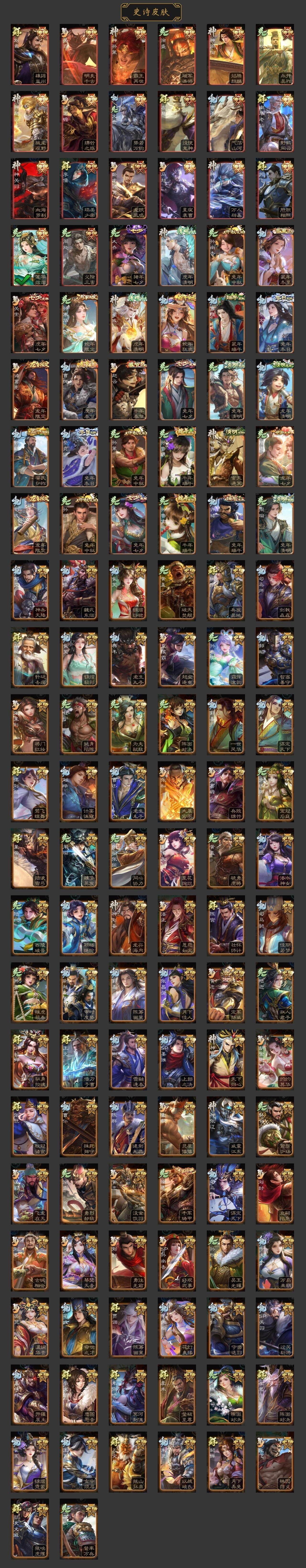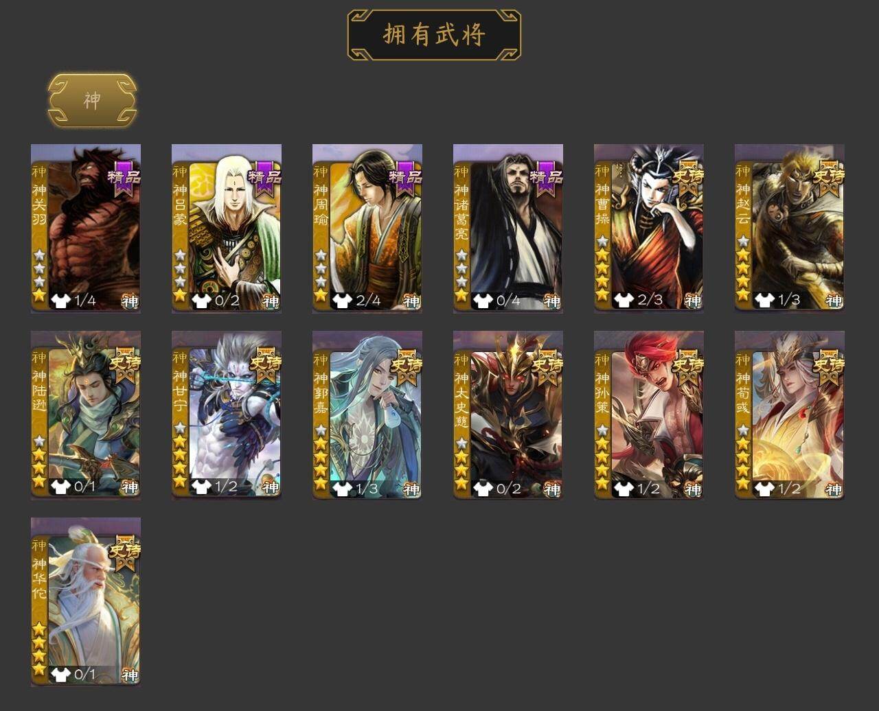 神曹操,神赵云,神陆逊,神甘宁,神郭嘉,神太史慈,神孙策,神荀彧,神华佗,神诸葛亮,王粲,杨修,王元姬,马钧,界钟会,界于禁,嵇康,陈琳,曹婴,曹纯,戏志才,谋曹丕,程昱,关索,谋诸葛亮,谋黄忠,谋赵云,谋马超,诸葛瞻,赵襄,王平,沙摩柯,谯周,花鬘,董允,谋孙策,周处,孙寒华