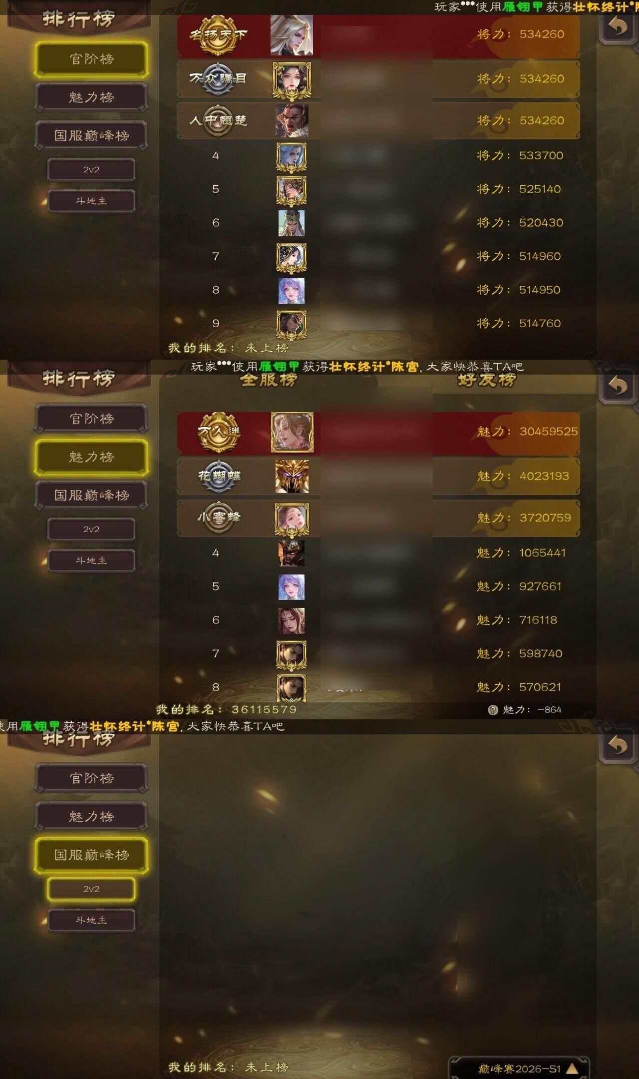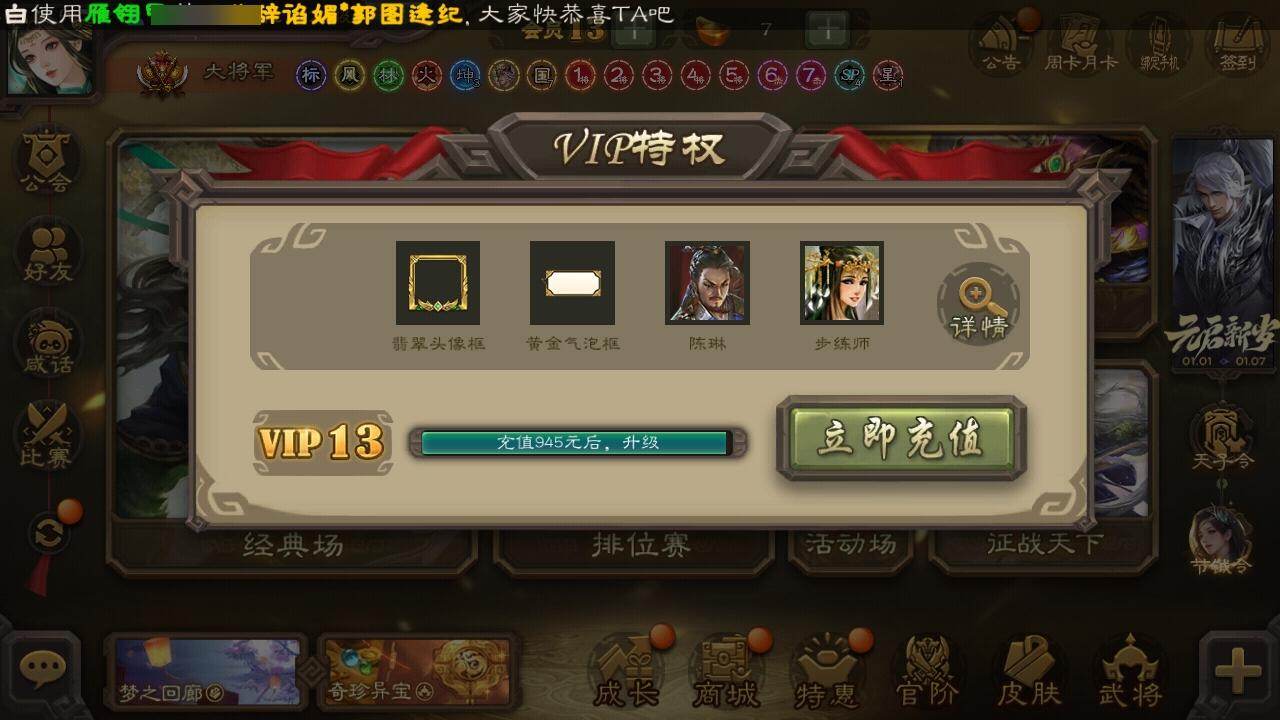 官阶:大将军;VIP等级:VIP13;史诗武将数量:64;动态皮肤数量:40