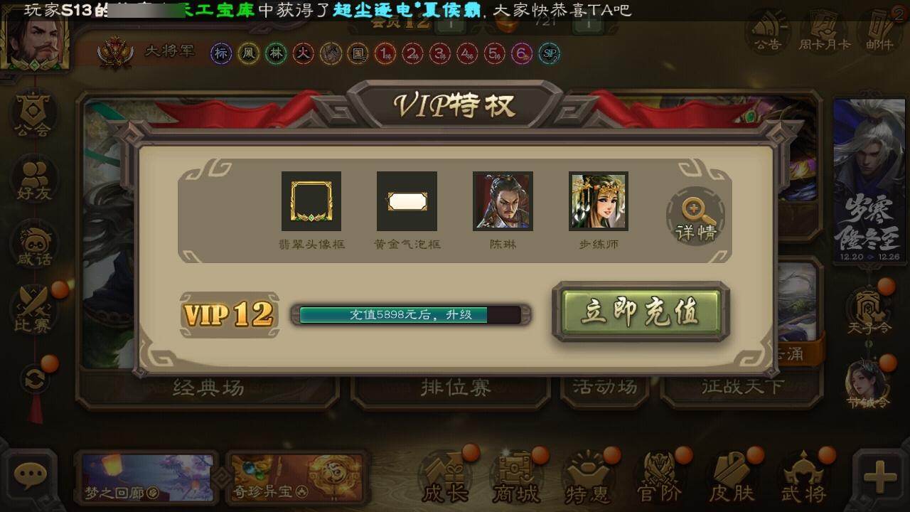 官阶:大将军;VIP等级:VIP12;史诗武将数量:38;动态皮肤数量:19