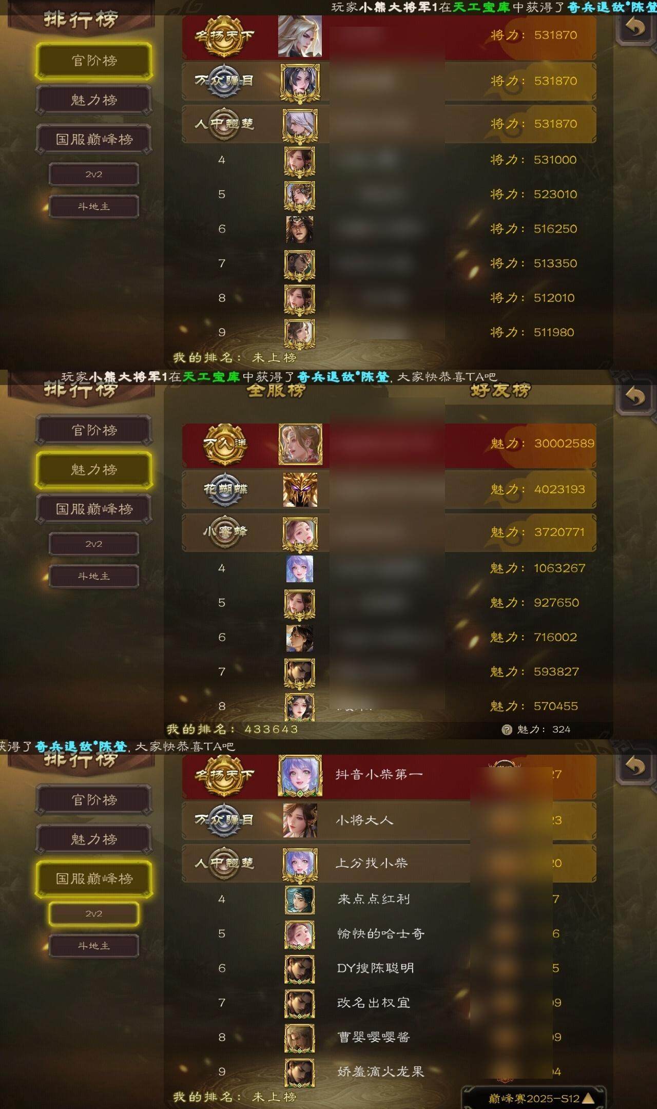 官阶:大将军;VIP等级:VIP12;史诗武将数量:38;动态皮肤数量:19;武将总数:345;史诗宝珠数量:0;将魂数量:2955;神将:8;魏国史诗武将:5;蜀国史诗武将:8;吴国史诗武将:2;群史诗武将:14