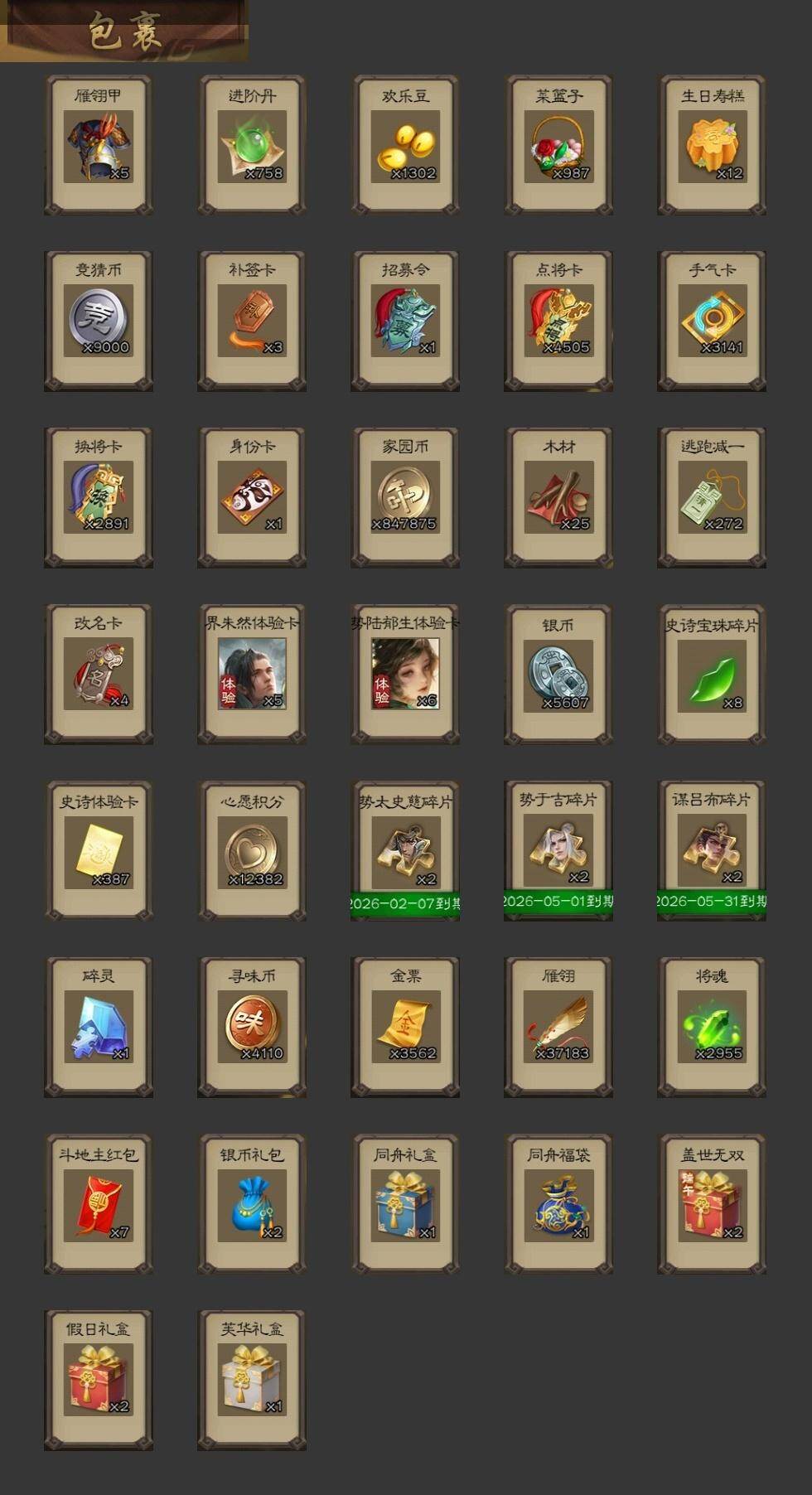 神曹操,神吕布,神赵云,神张辽,神荀彧,神关羽,神吕蒙,神周瑜,杨修,文鸯,界于禁,曹纯,戏志才,谋曹丕,关索,谋刘备,谋黄忠,谋赵云,诸葛瞻,赵襄,花鬘,董允,谋黄盖,界徐盛,十常侍,界沮授,左慈,郑玄,张让,星黄忠,麹义,庞德公,南华老仙,刘焉,沮授,杜预,许攸,笮融,神荀彧-匡