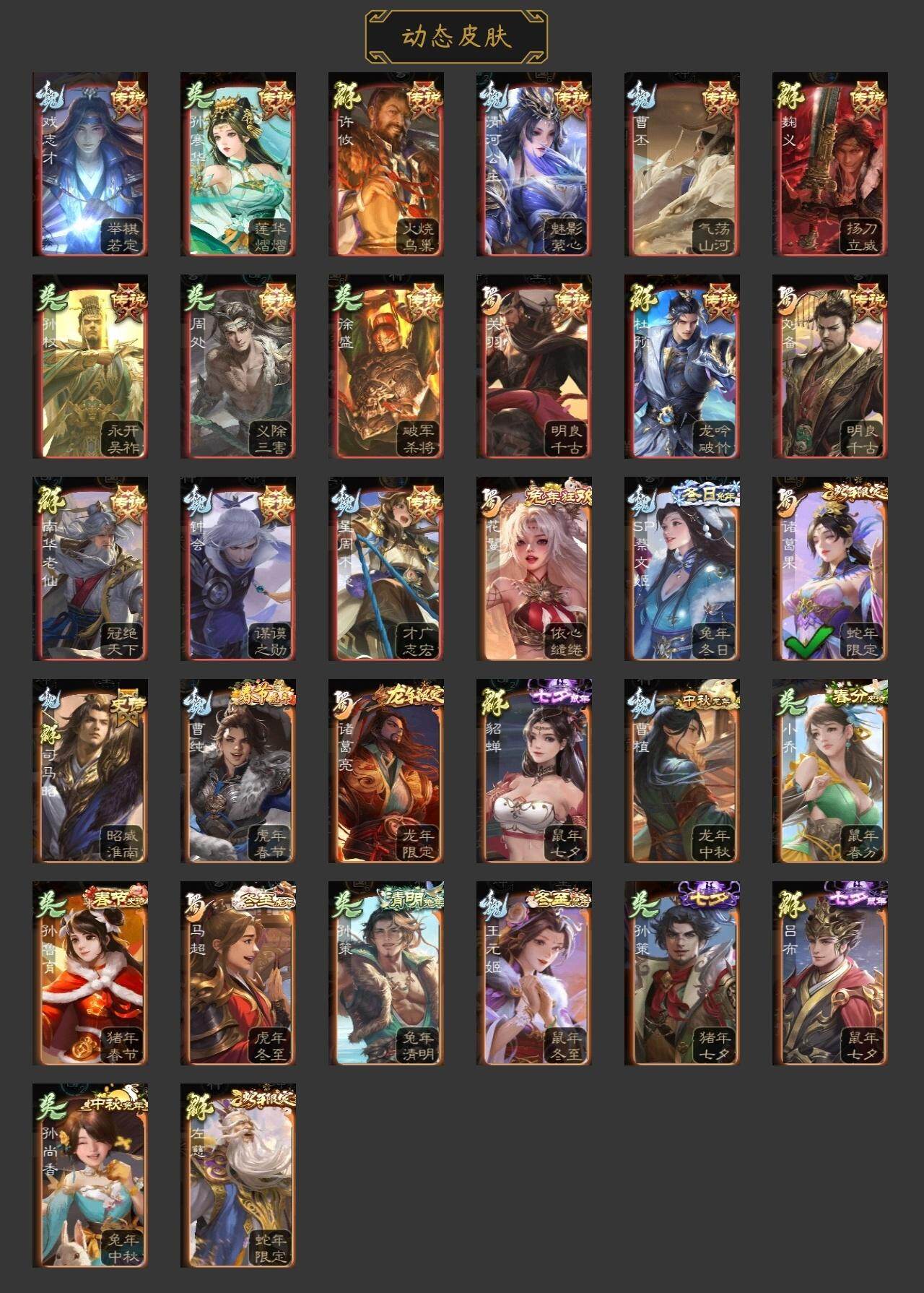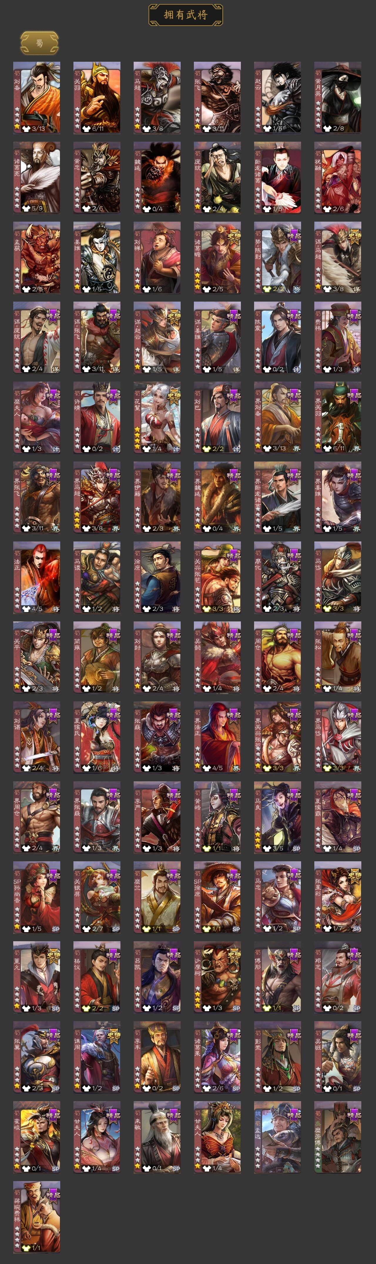 神吕布,神赵云,神陆逊,神刘备,神张辽,神华佗,神吕蒙,曹髦,星周不疑,王粲,文鸯,王元姬,魏-司马昭,界钟会,界于禁,郝昭,曹婴,曹纯,戏志才,清河公主,谋赵云,谋马超,诸葛瞻,张星彩,沙摩柯,谯周,花鬘,董允,谋孙策,骆统,界朱然,界徐盛,界步练师,谋郭嘉,十常侍,左慈,郑玄,