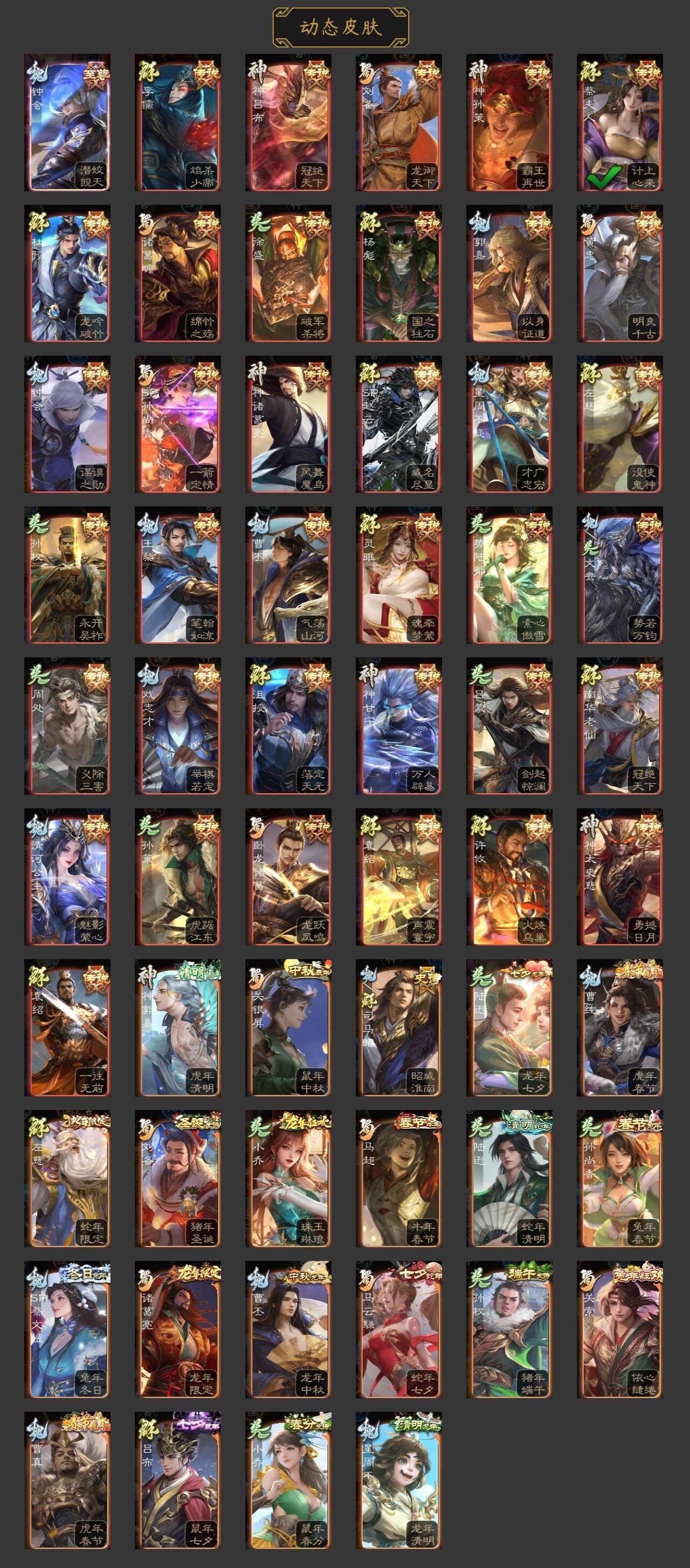 神吕布,神赵云,神甘宁,神张辽,神郭嘉,神孙策,神吕蒙,神周瑜,神诸葛亮,SP司马昭,星周不疑,王粲,杨修,文鸯,魏-司马昭,界钟会,界于禁,嵇康,郝昭,陈琳,曹婴,曹纯,戏志才,清河公主,关索,马云騄,谋赵云,谋马超,诸葛瞻,赵襄,王平,沙摩柯,谯周,界黄忠,花鬘,董允,谋孙