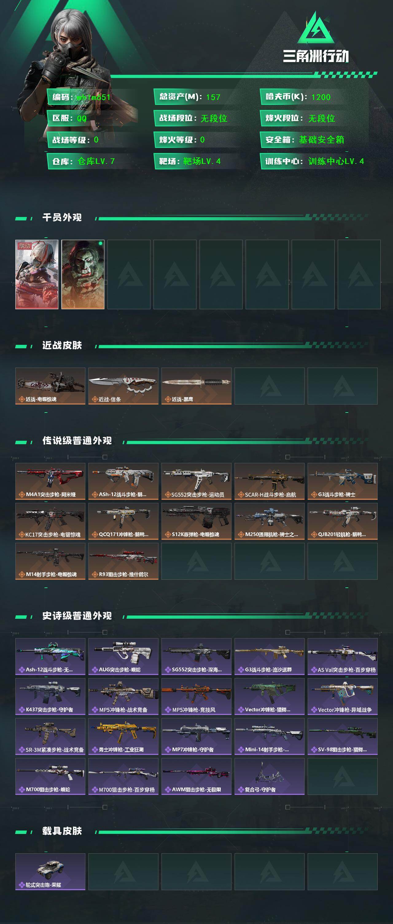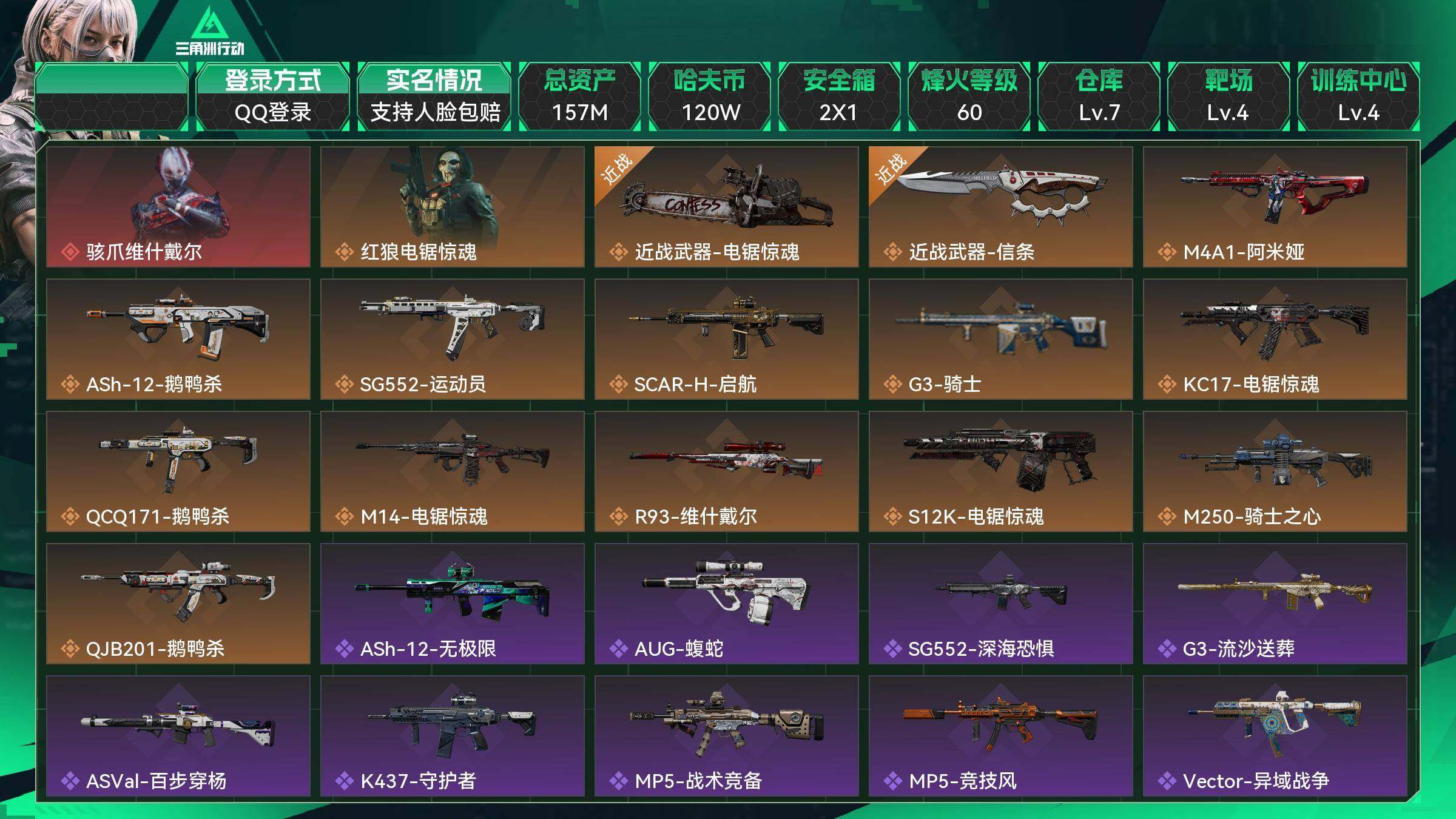 总资产:157M,哈夫币:120W,武器皮肤114;烽火60级:,【安全箱】基础安全箱;【特勤处等级】仓库LV.7,靶场LV.4,训练中心LV.4,收藏室LV.1,潜水中心LV.0;【捆绑包4】电锯惊魂捆绑包,维什戴尔捆绑包,鹅鸭杀捆绑包,电锯惊魂干员捆绑包;【干员皮肤2】骇爪维什戴尔,红狼电锯惊魂;【近战皮肤】近战武器-电锯惊魂,近战武器-信条,近战武器-黑鹰;【步枪皮肤】M4A1突击步枪-阿米娅,ASh-12战斗步枪-鹅鸭杀,SG552突击步枪-运动员,SCAR-H战斗步枪-启航,G3战斗步