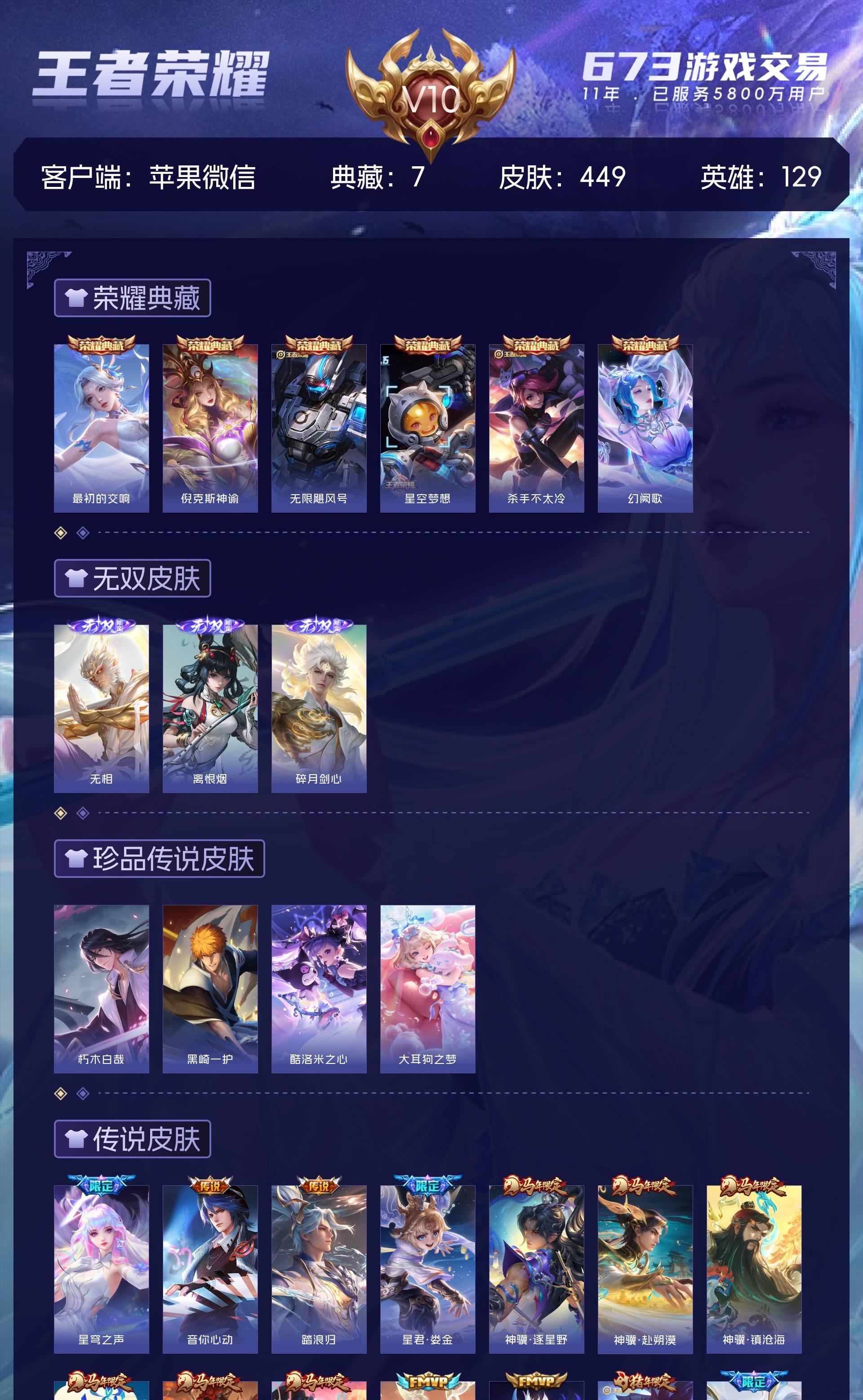 苹果微/非凡王者/449皮肤/129英雄/6典藏/0珍品无双/3无双/4珍品传说/55传说/121
